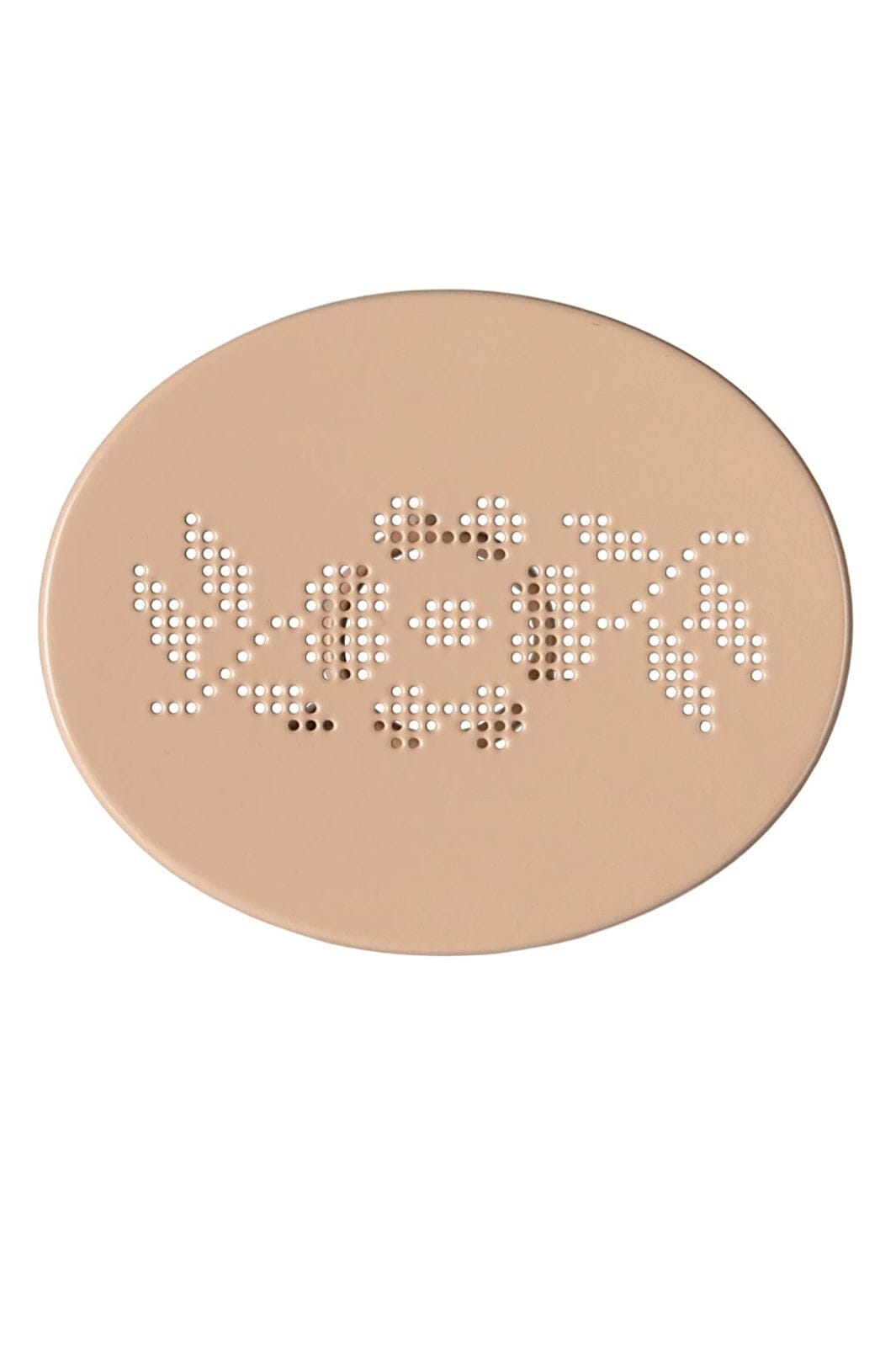 Das rosa Metall hat ein feines Lochmuster auf Tisch und Bank. Die kleinen Löcher schaffen einen leichten und luftigen Ausdruck.