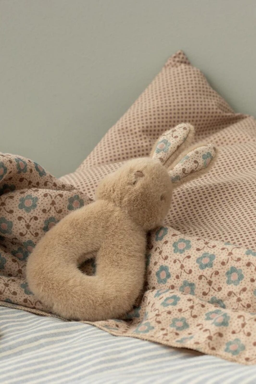 Ein weiches Kaninrassel in hellem Pfirsich von Maileg. Das Rassel kommt in einer dekorativen Geschenkbox und hat blumenmusterte Ohren mit einem inneren Rasselgeräusch.