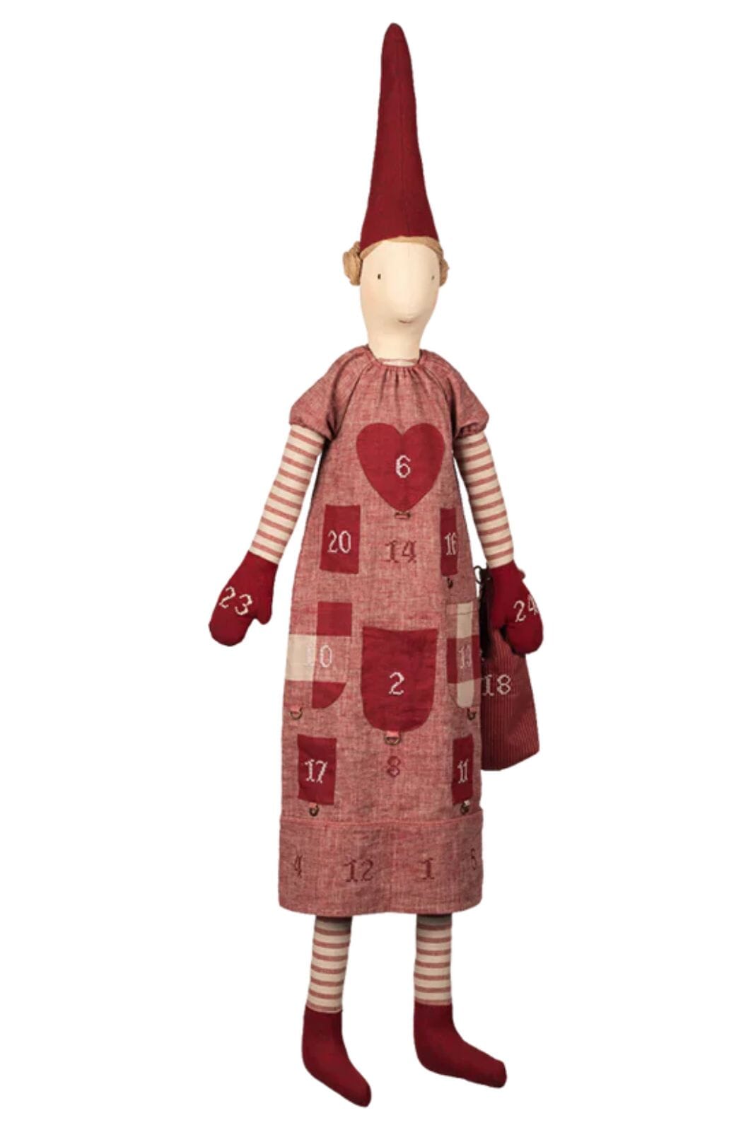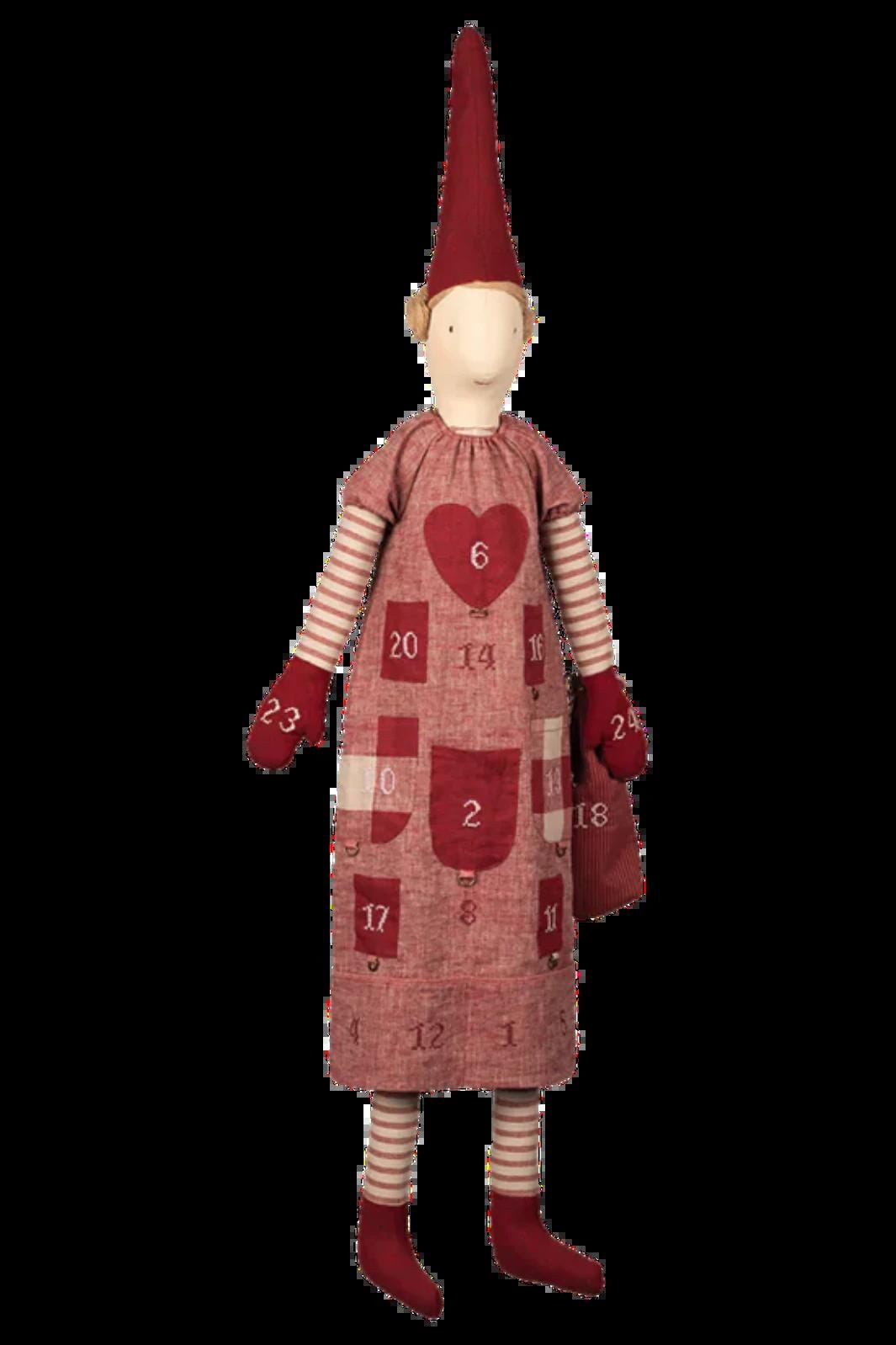 Roter Kalenderwichtel von Maileg mit nummerierten Taschen auf dem Kleid. Der 121 cm hohe Wichtel hat gestreifte Arme und Beine sowie eine Schlaufe im Nacken zum Aufhängen.