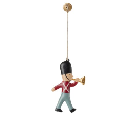 Metallornament von Maileg in Form eines Soldaten, der Trompete spielt. Das Ornament ist handbemalt und kann am Weihnachtsbaum aufgehängt werden.