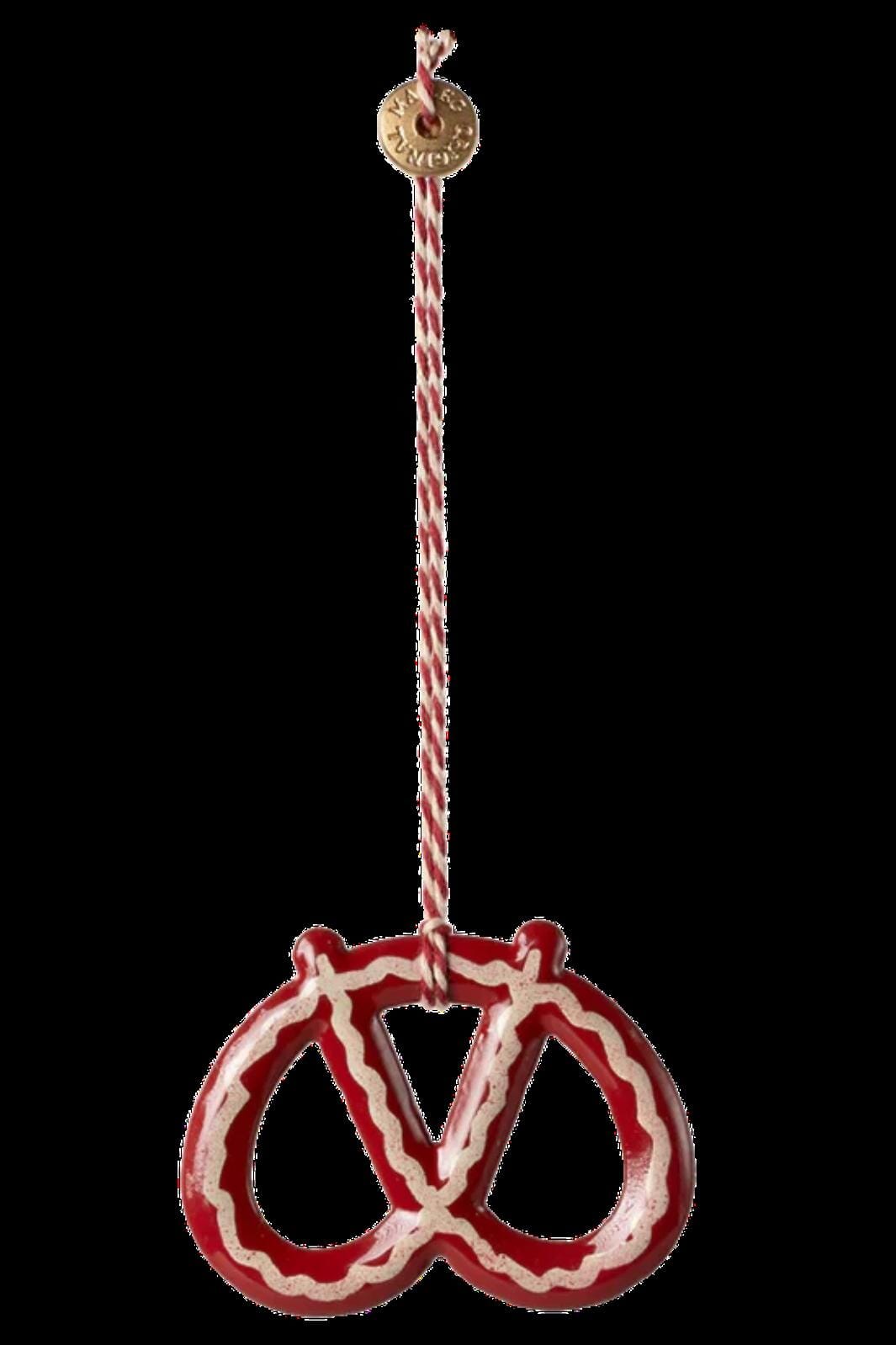 Metallanhänger von Maileg in Brezelform mit roten und weißen Streifen. Hergestellt aus Metall mit handbemalten Details und einer gedrehten Aufhängung.
