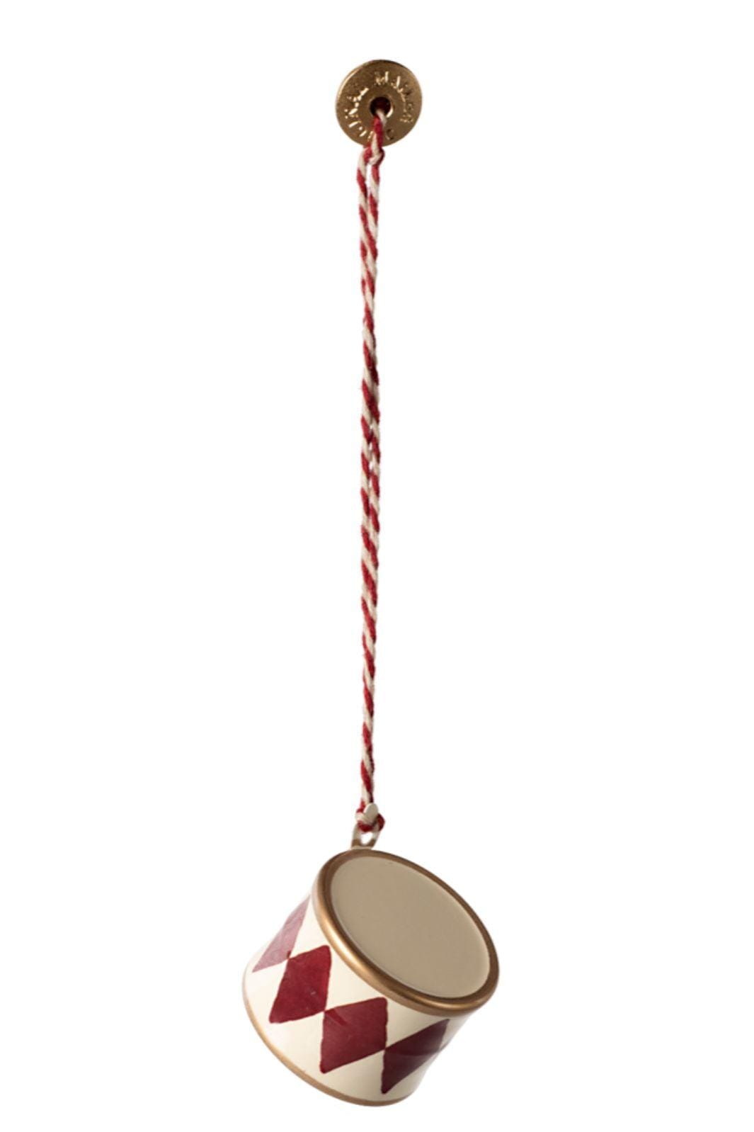 Kleiner Metallanhänger in Trommelform von Maileg mit rot-weißem Rautenmuster. Aus Metall gefertigt mit handbemalten Details und gedrehter Aufhängeschnur.