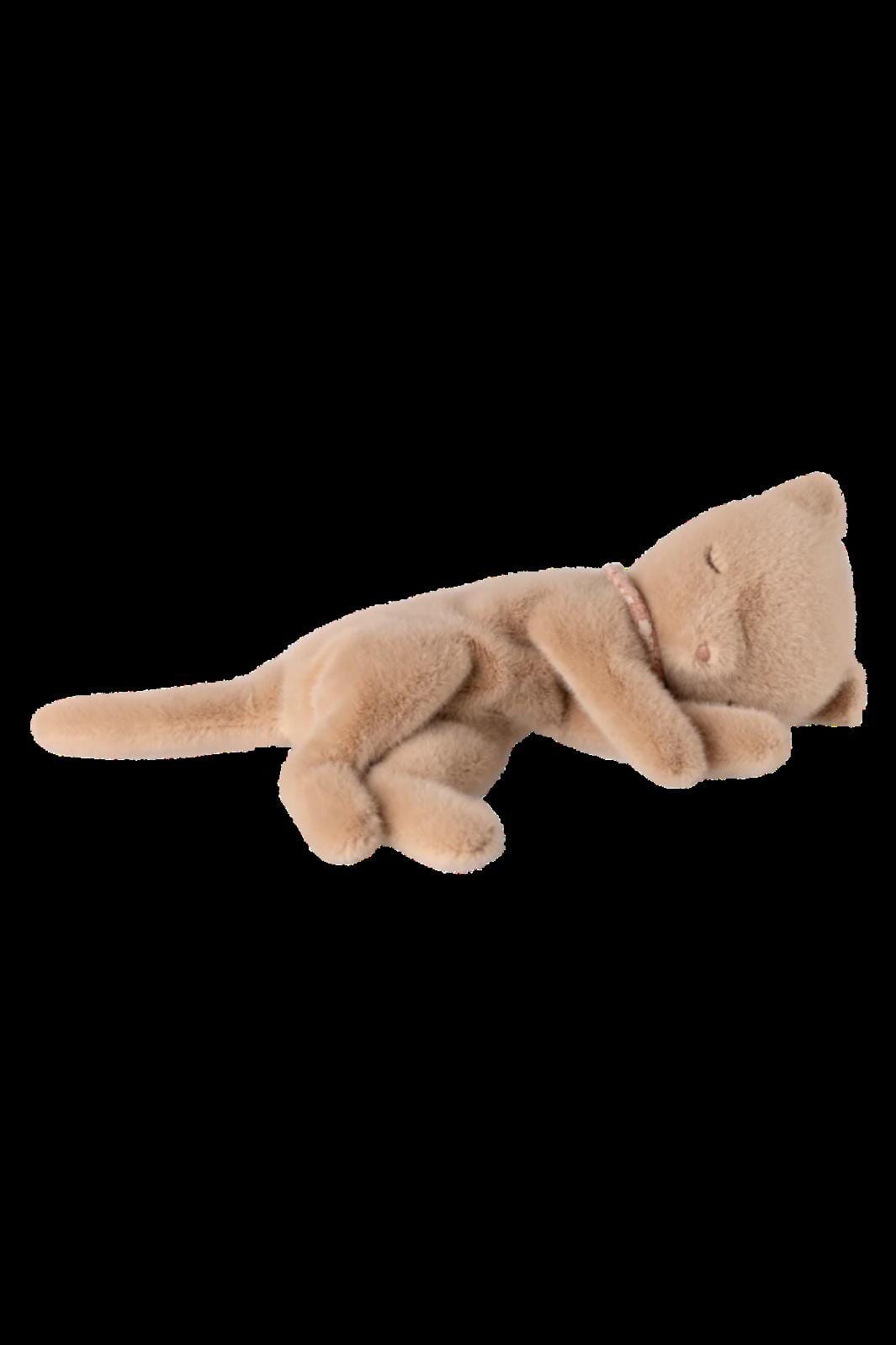 Ein Plüschkätzchen in schlafender Position von Maileg. Die Figur hat einen langen Schwanz und einen kleinen Kragen um den Hals.