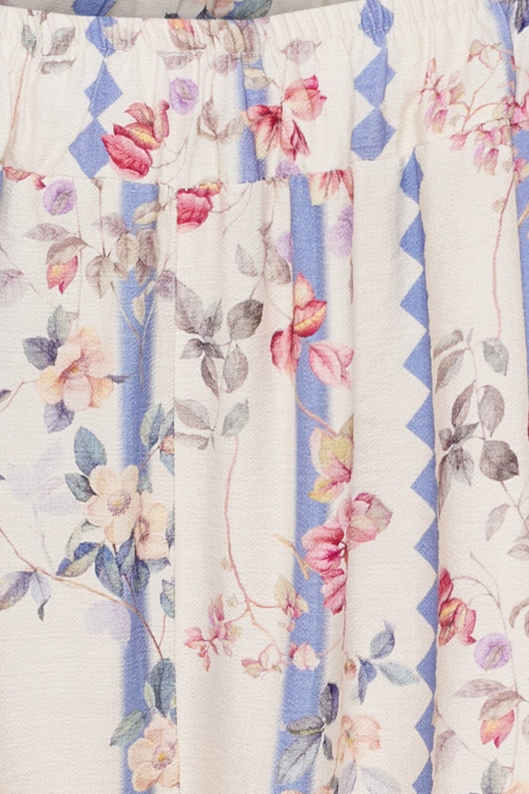Hosen von Marta Du Chateau mit Blumenmuster in Creme-, Pink- und Blautönen. Die Hosen haben eine hohe Taille und eine Knöchellänge mit Rüschendetails und elastischem Verschluss.