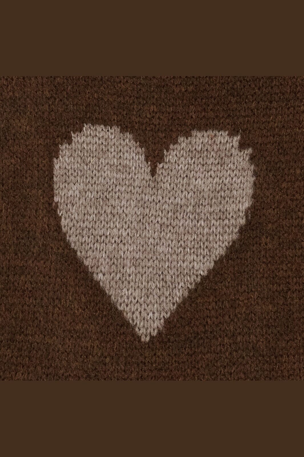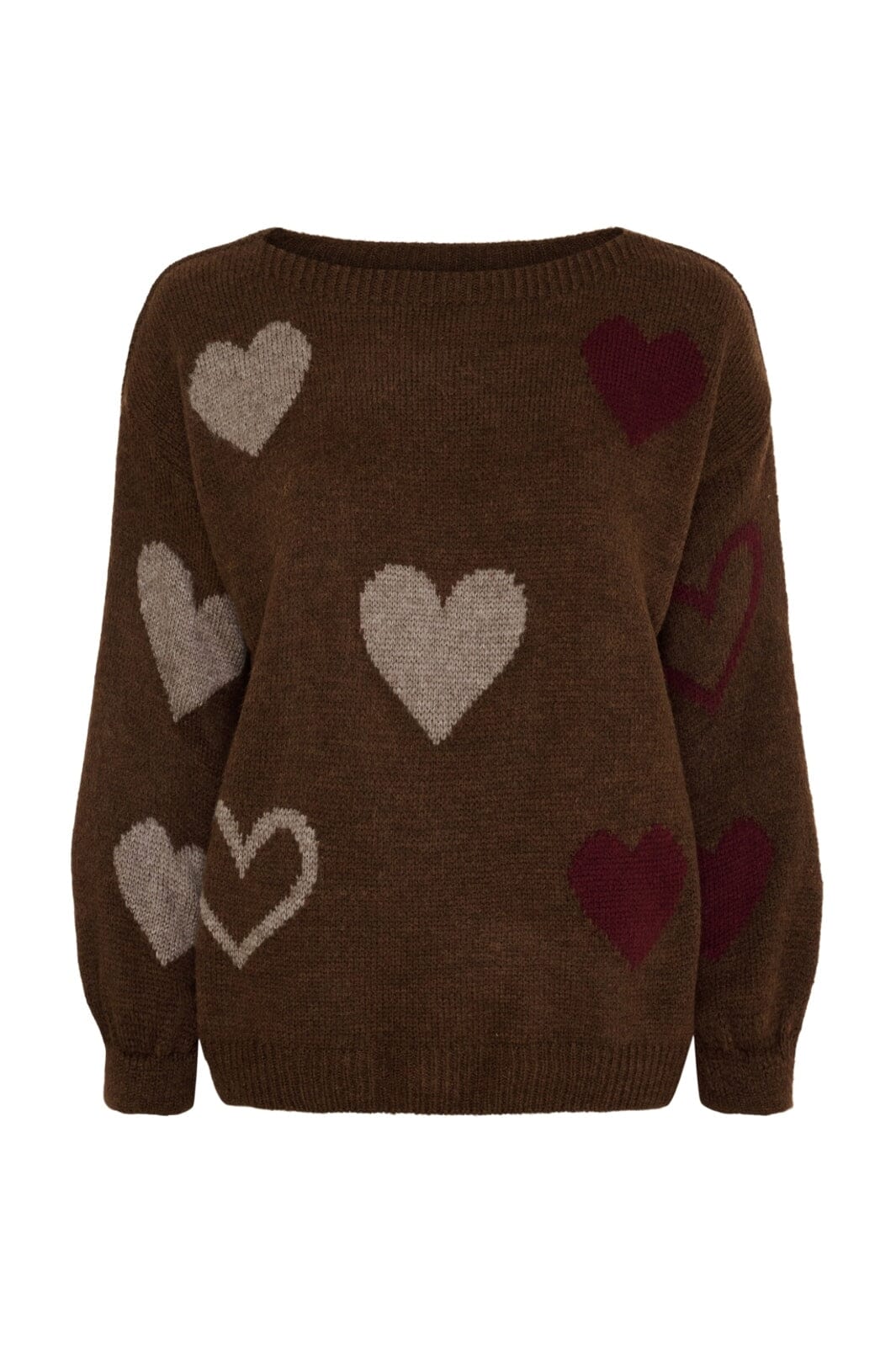 Brauner Strickpullover von Marta Du Chateau mit herzförmigen Mustern auf der Vorderseite in Grau und Bordeaux. Die Rückseite ist einfarbig braun ohne Muster.