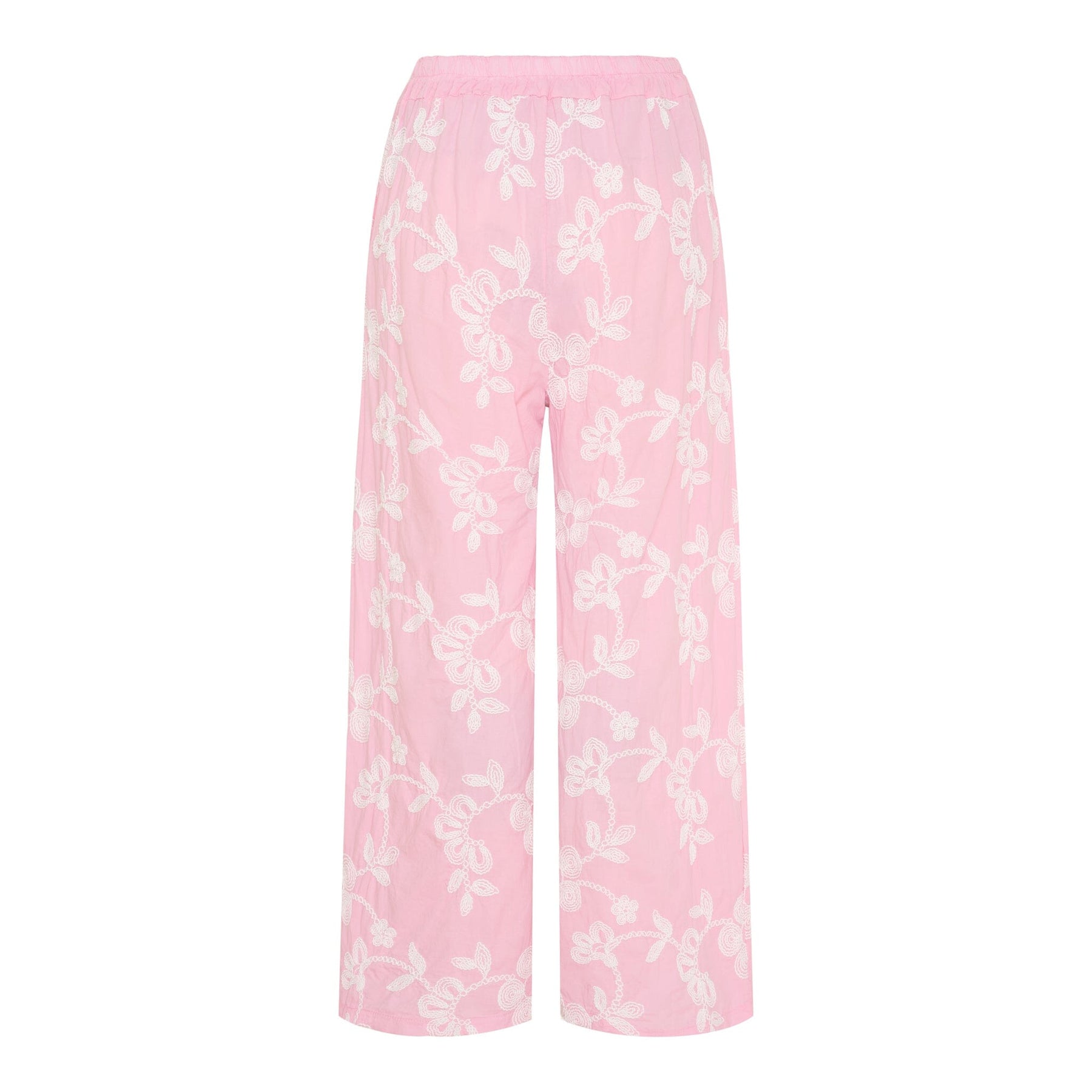 Rosa Hosen von Marta Du Chateau mit weißer Blumenstickerei. Die langen Beine haben einen breiten Schnitt, und der Taillenbund ist elastisch für einfaches An- und Ausziehen.