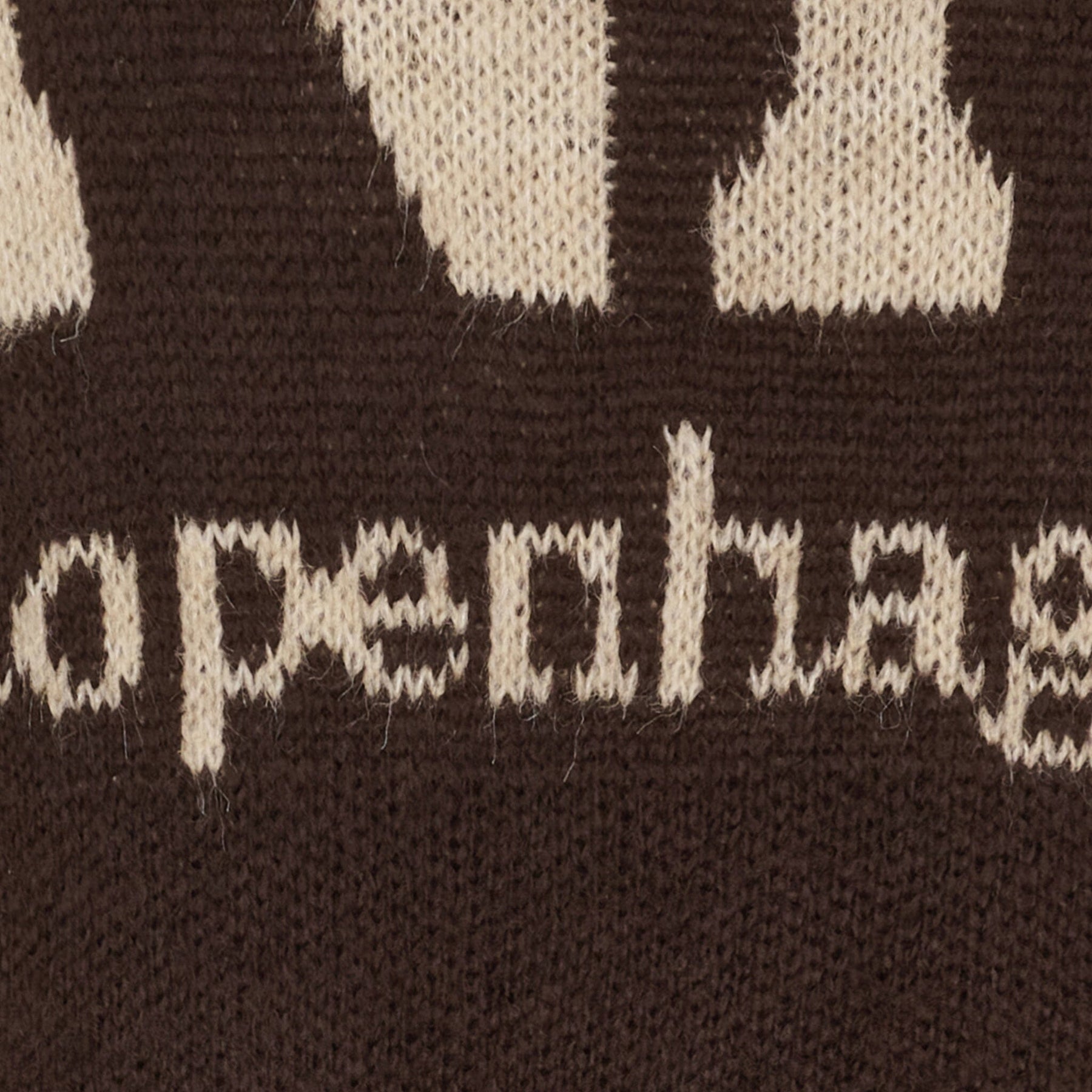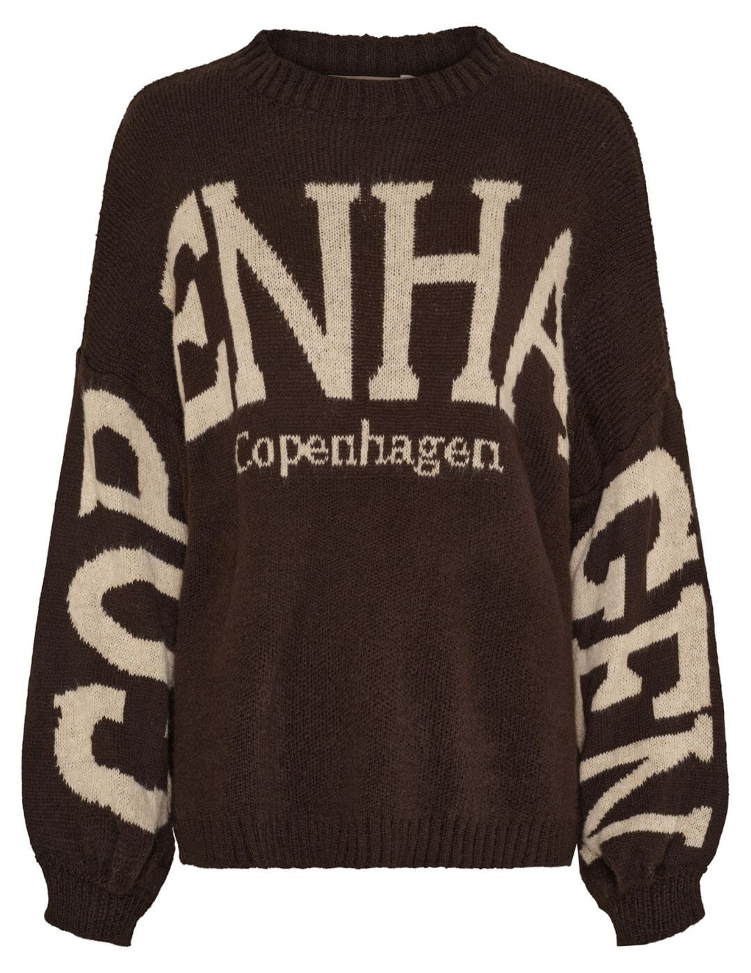 Dunkelbrauner Strickpullover von Marta Du Chateau mit einem bedruckten Textdesign in Beige. Der Pullover hat eine oversized Passform und einen runden Halsausschnitt.