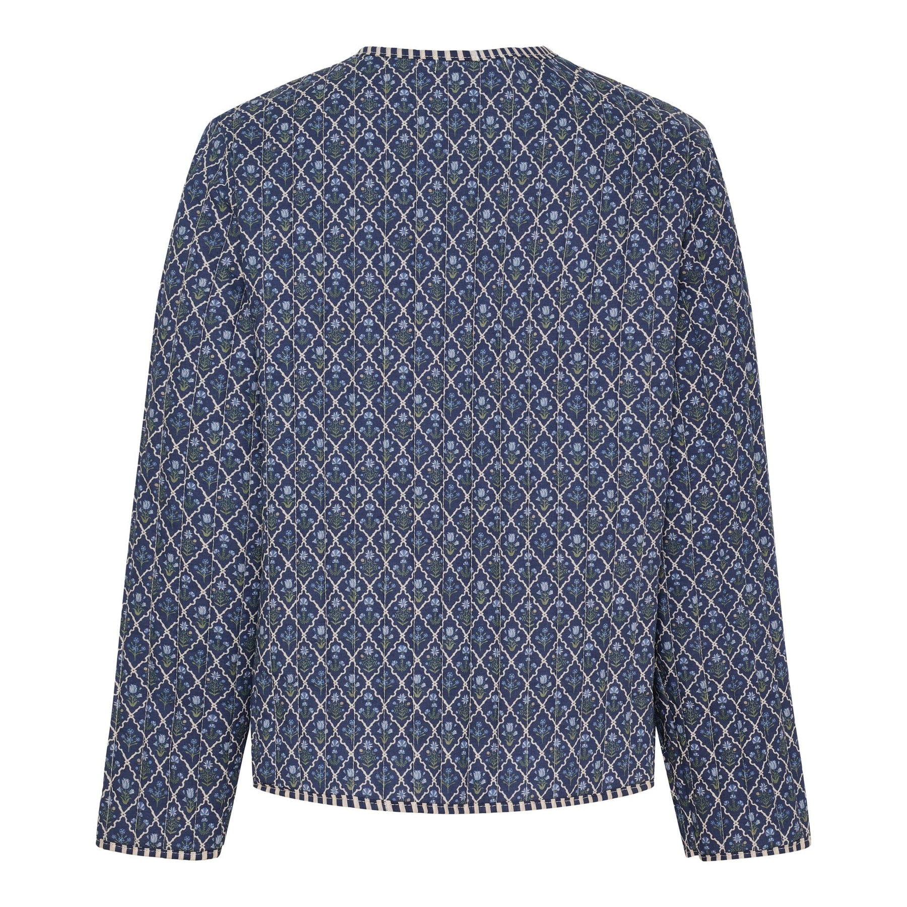 Dunkelblaue Jacke von Marta Du Chateau mit Karomuster und dekorativen Nähten. Sie hat einen runden Halsausschnitt, einen Knopfverschluss vorne und zwei praktische Vordertaschen mit Kontrastmuster.
