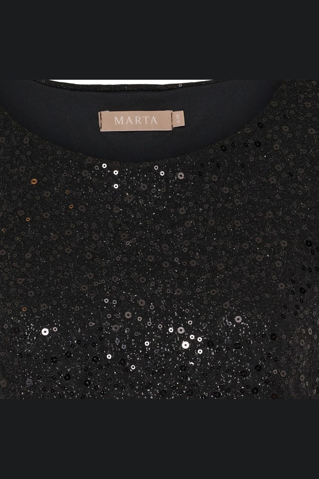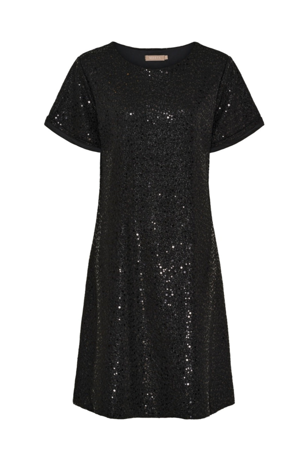 Schwarzes Kleid von Marta Du Chateau mit Pailletten über das gesamte Kleid. Das kurze Modell hat einen runden Ausschnitt und kurze Ärmel, was es einfach macht, es für Feste zu stylen.