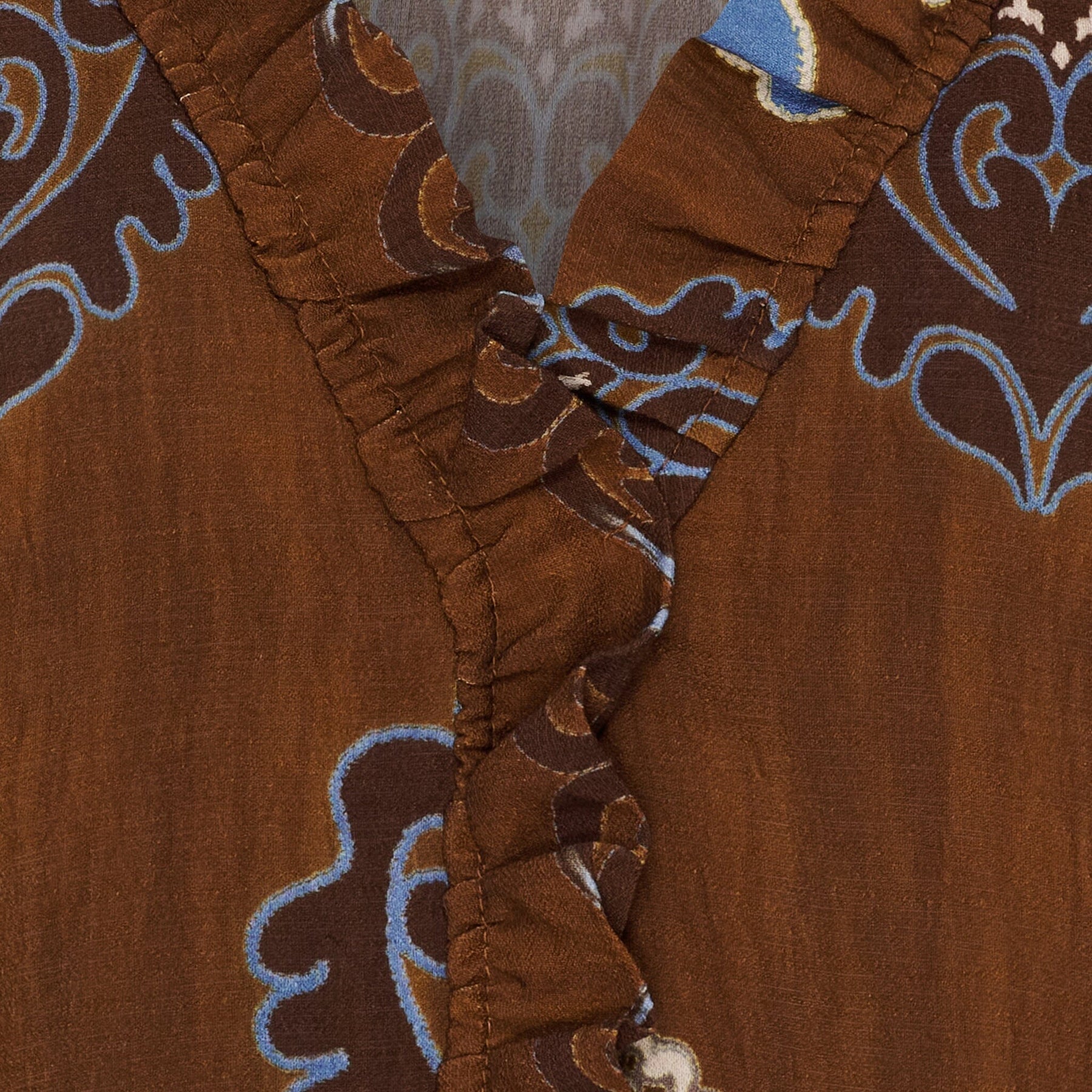 Braunes Hemd von Marta Du Chateau mit Paisley-Muster in blauen und weißen Nuancen. Das Hemd hat eine lockere Passform mit V-Ausschnitt und gerafften Details entlang der Vorderseite.