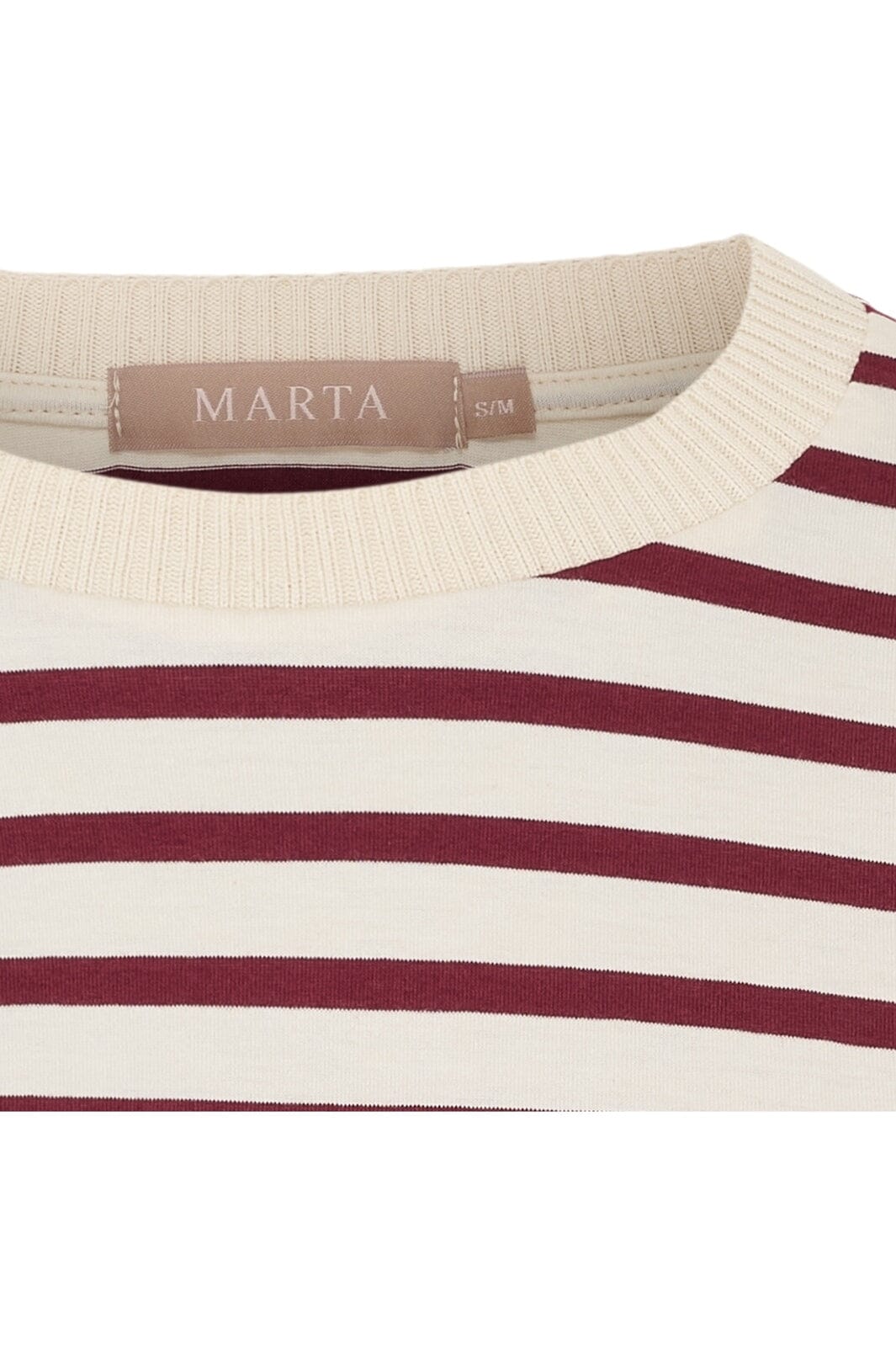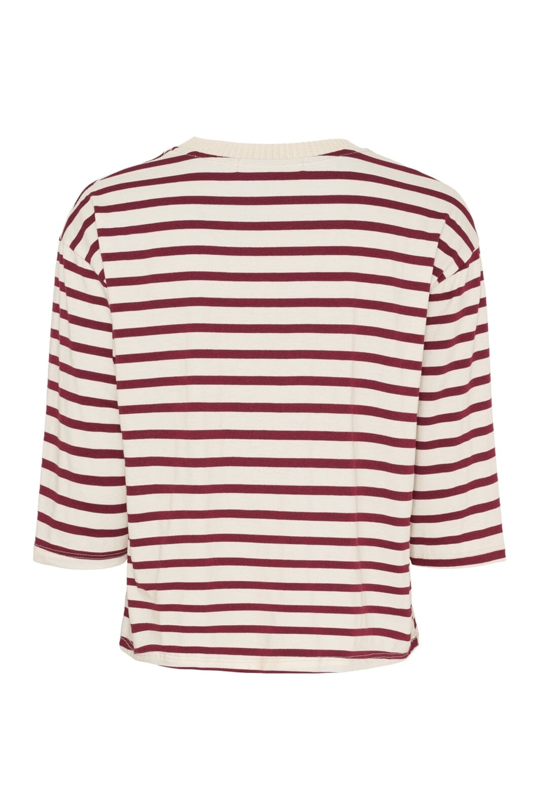 Gestreiftes T-Shirt von Marta Du Chateau in Beige und Bordeaux. Das T-Shirt hat einen runden Halsausschnitt und 3/4-lange Ärmel mit horizontalen Streifen rundherum.