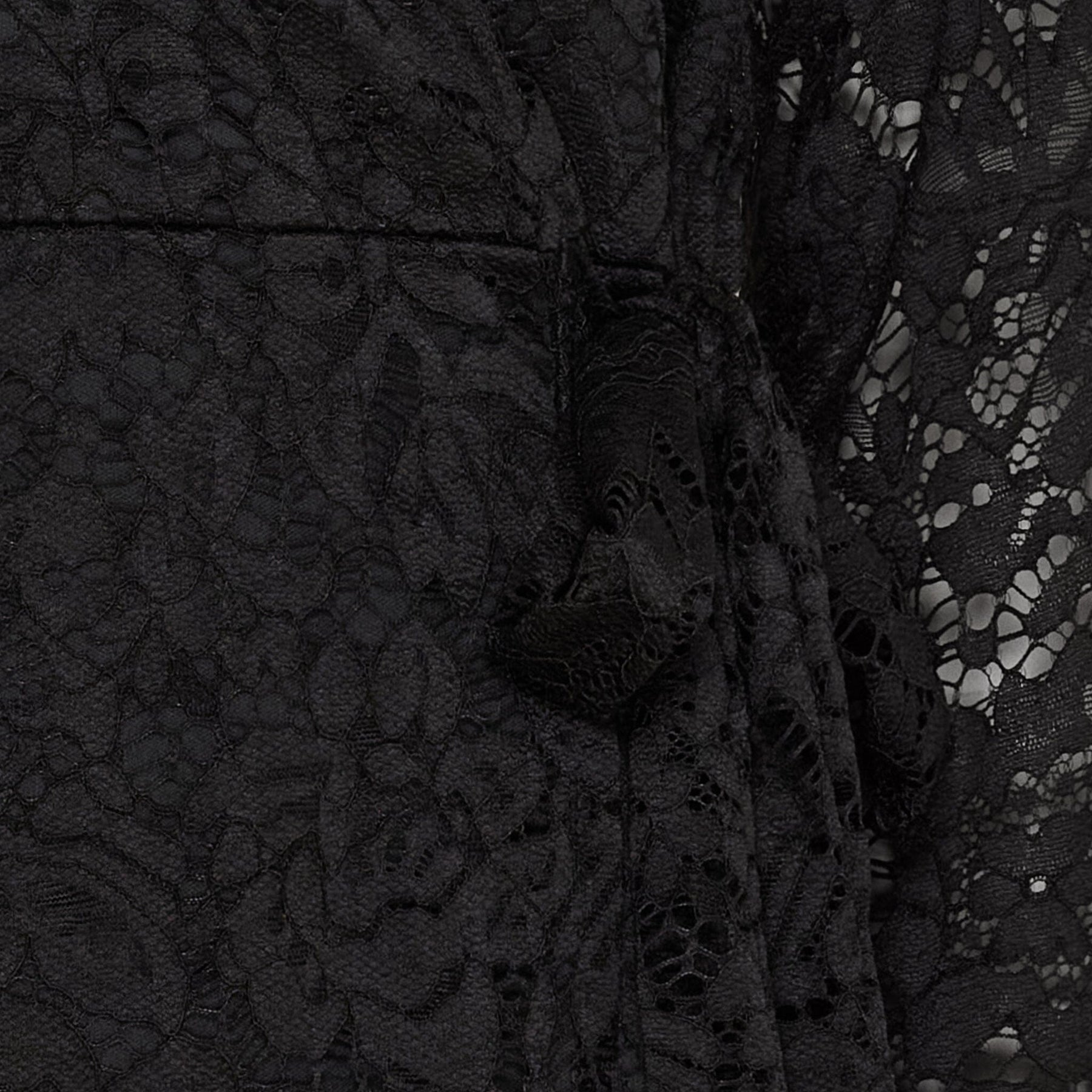 Schwarzes knielanges Kleid von Marta Du Chateau mit Spitzendetails. Das Kleid hat einen V-Ausschnitt und ein Bindeband in der Taille, das es ermöglicht, die Passform anzupassen.
