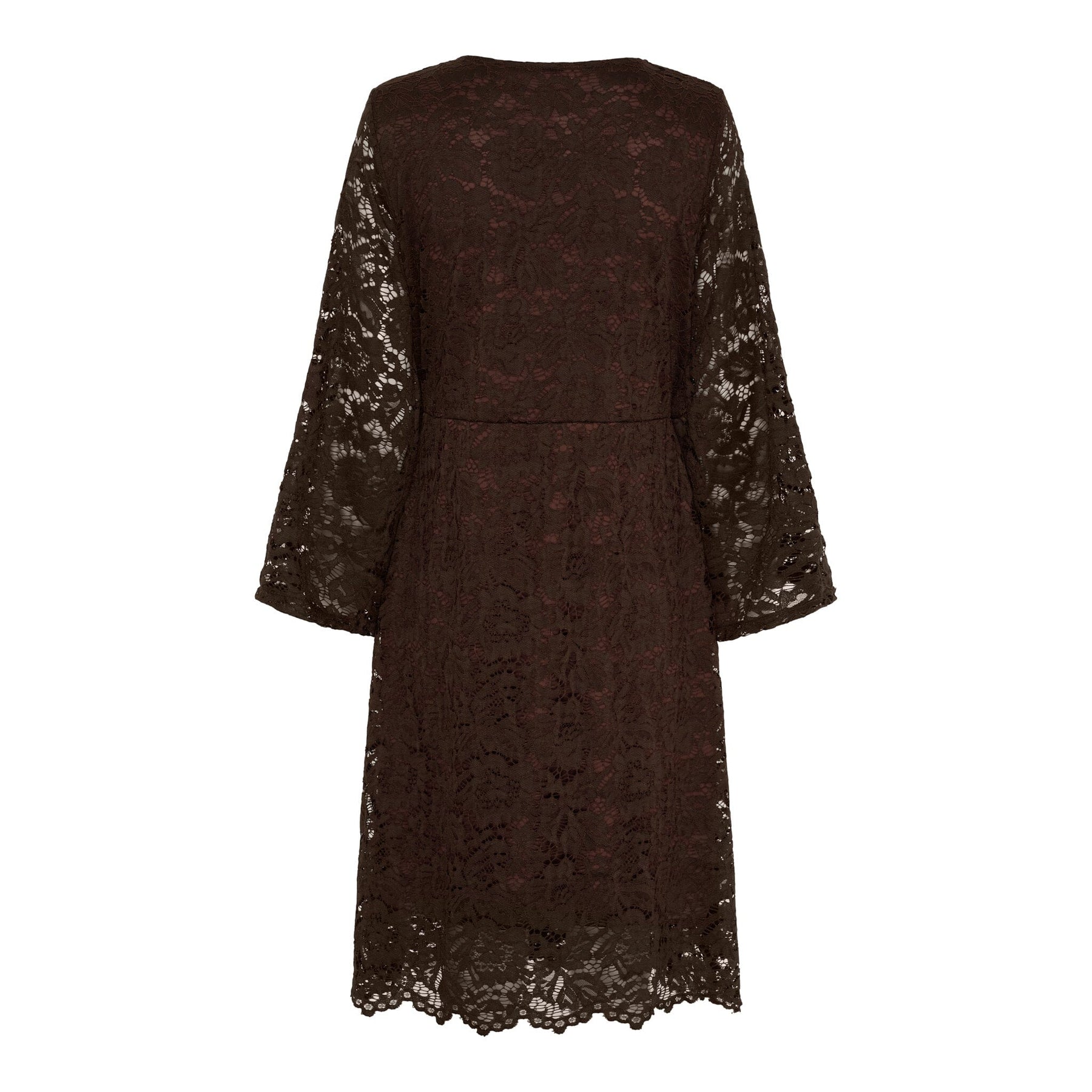 Braunes knielanges Kleid von Marta Du Chateau mit Spitzenoberfläche. Das Kleid hat einen V-Ausschnitt und 3/4-Ärmel sowie ein Bindeband an der Seite, das eine schlankmachende Passform verleiht.
