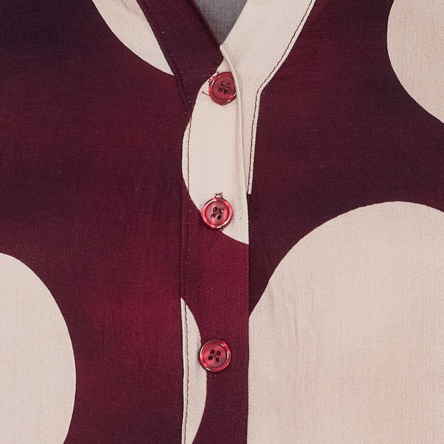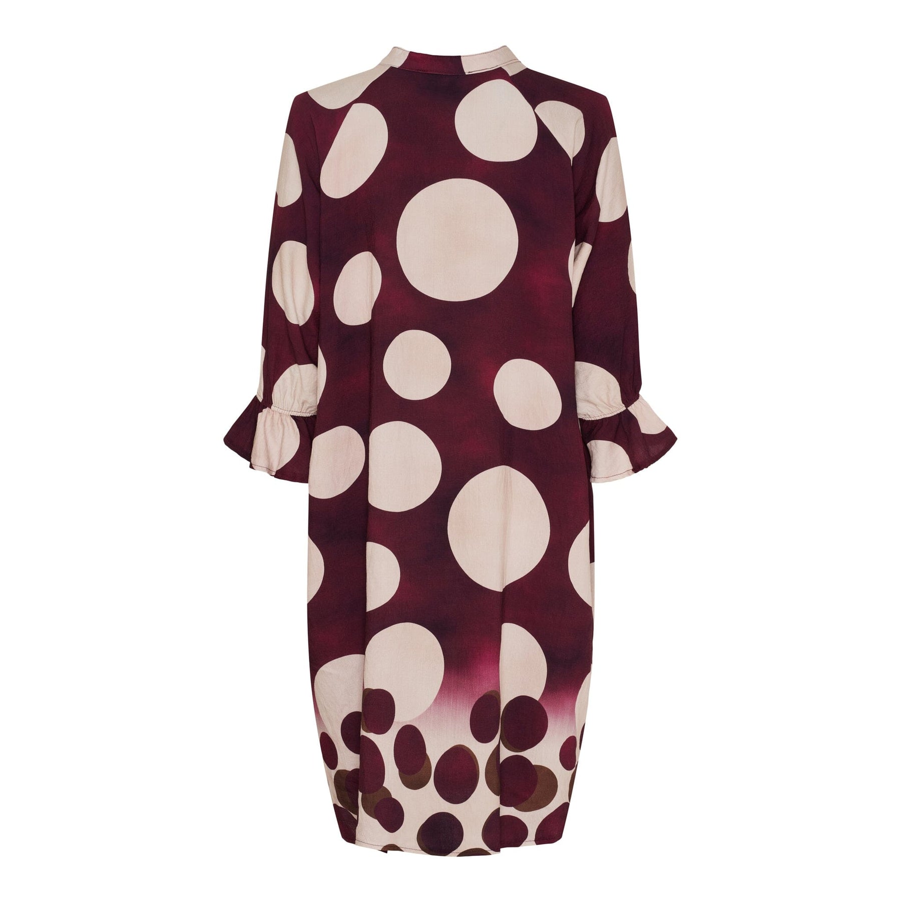 Kleid von Marta Du Chateau in Bordeaux mit großen weißen Punkten und einem Ombre-Effekt am Saum. Das Kleid hat einen Hemdkragen, 3/4-Ärmel mit Rüschen und Knöpfe vorne.