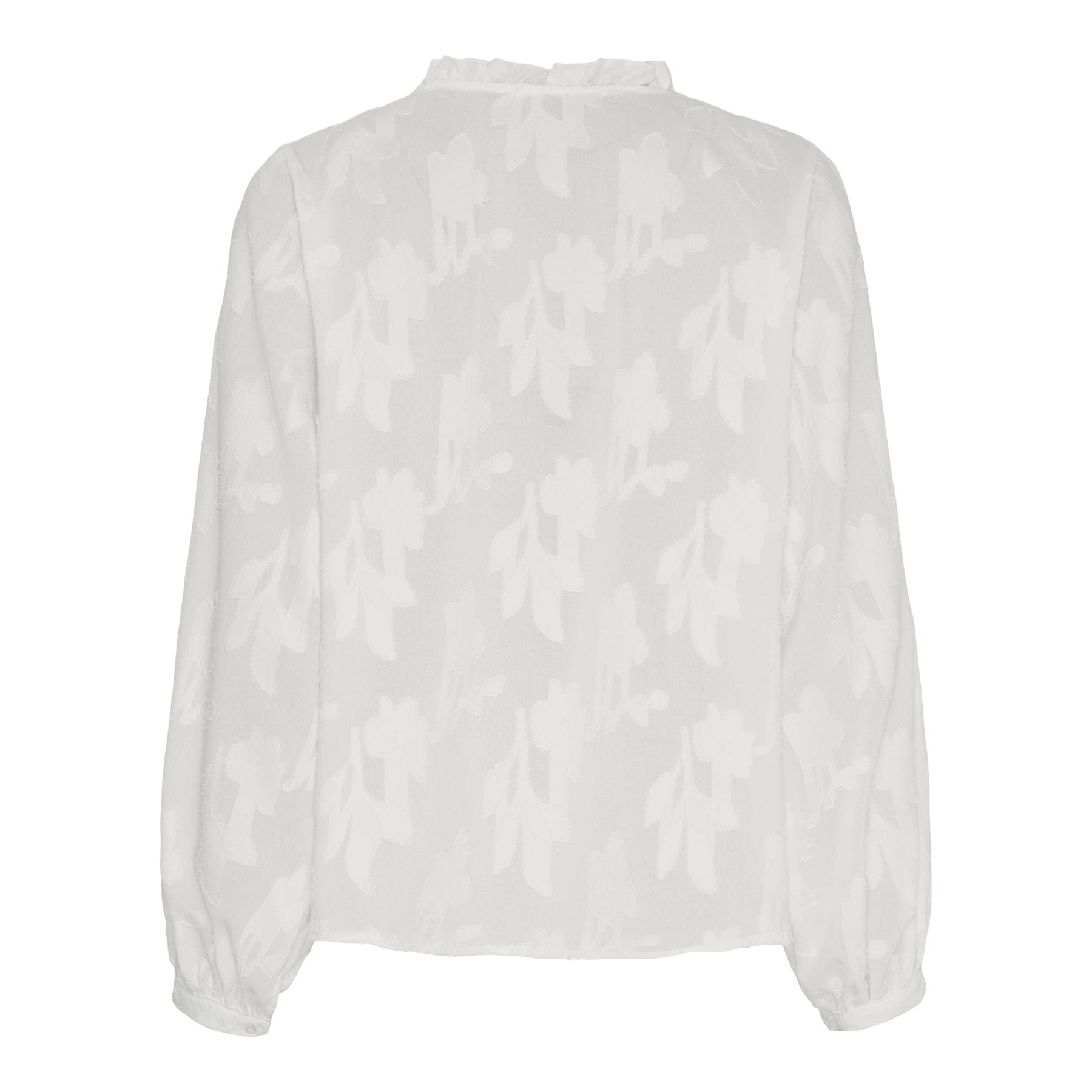 Weiße Bluse von Marta Du Chateau mit einem gestickten Blumenmuster. Die Bluse hat Rüschen-Details entlang der Vorderseite und ist als Pullover ohne Verschluss gestaltet.