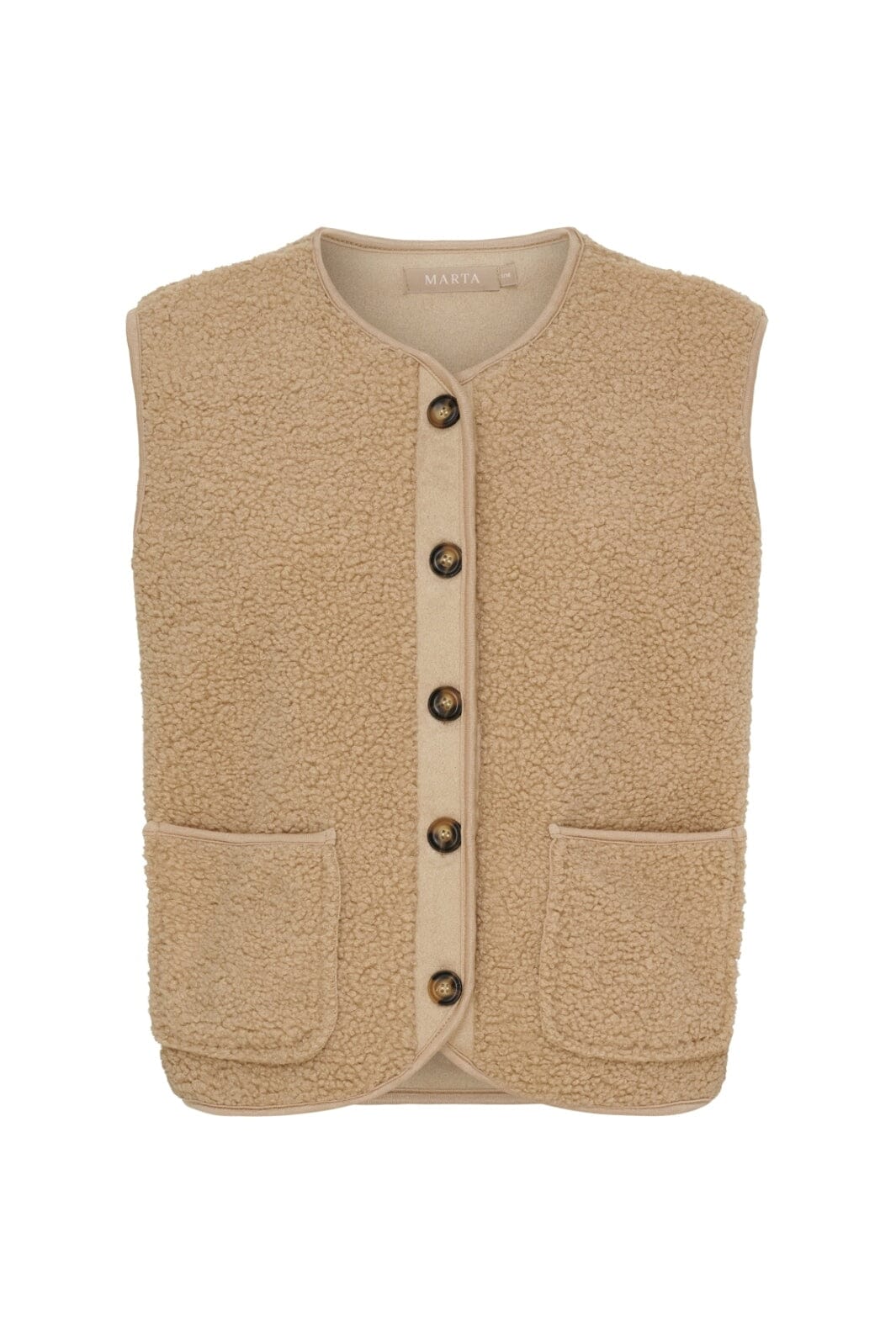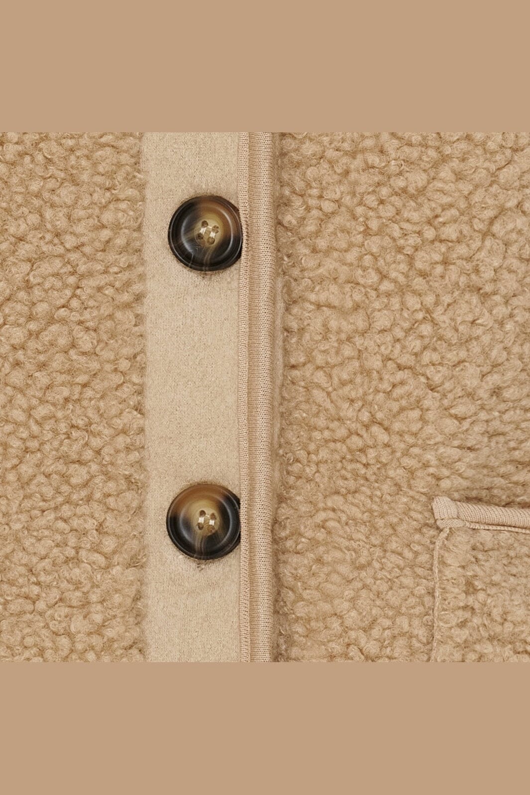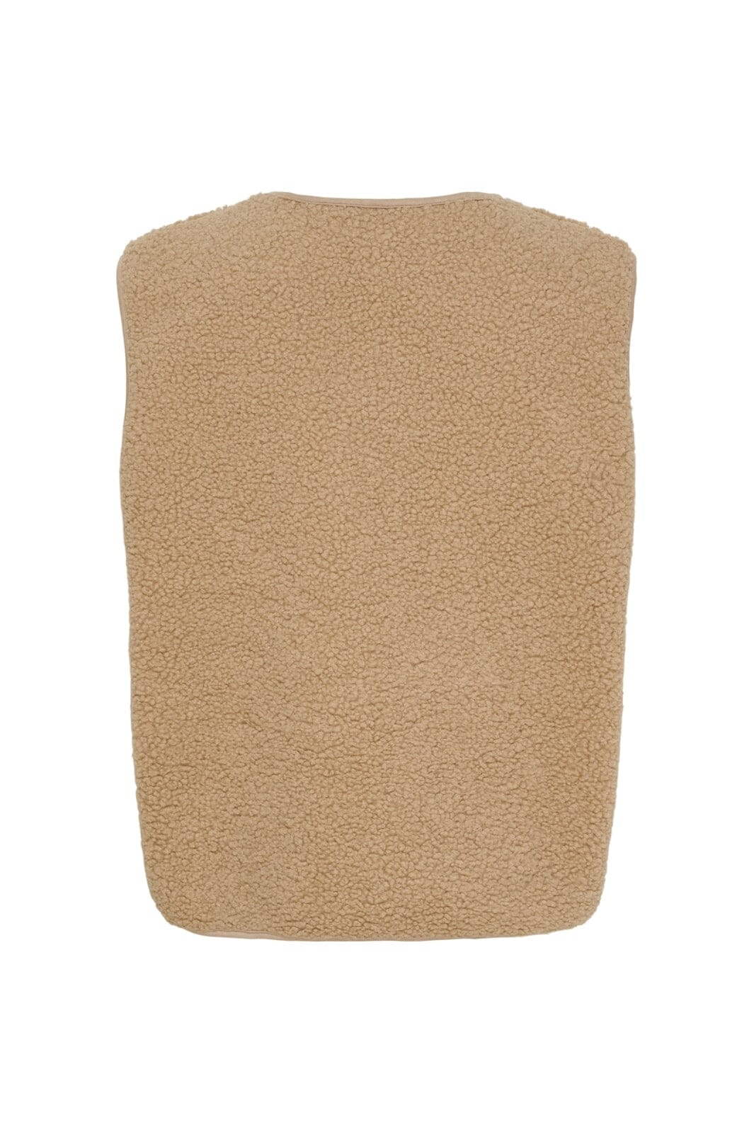 Weste von Marta Du Chateau in Kamel-Farbe mit weichem, teddybärähnlichem Material. Sie hat einen praktischen Knopfverschluss und zwei geräumige Taschen vorne.