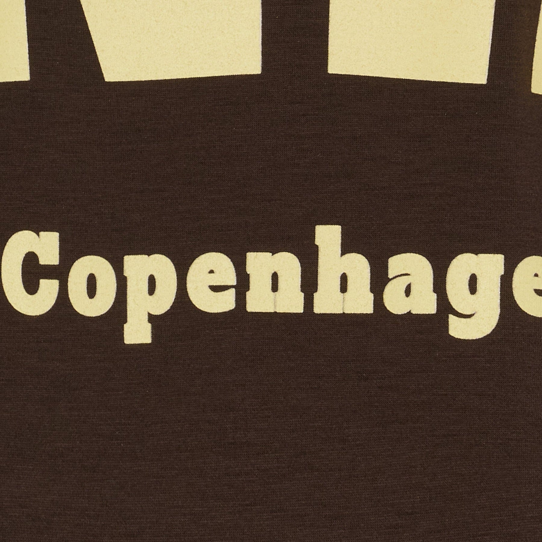 Braunes Sweatshirt von Marta Du Chateau mit Rundhalsausschnitt und oversized Passform. Es hat große gelbe Buchstaben auf der Vorderseite und an den Ärmeln mit dem Schriftzug COPENHAGEN.