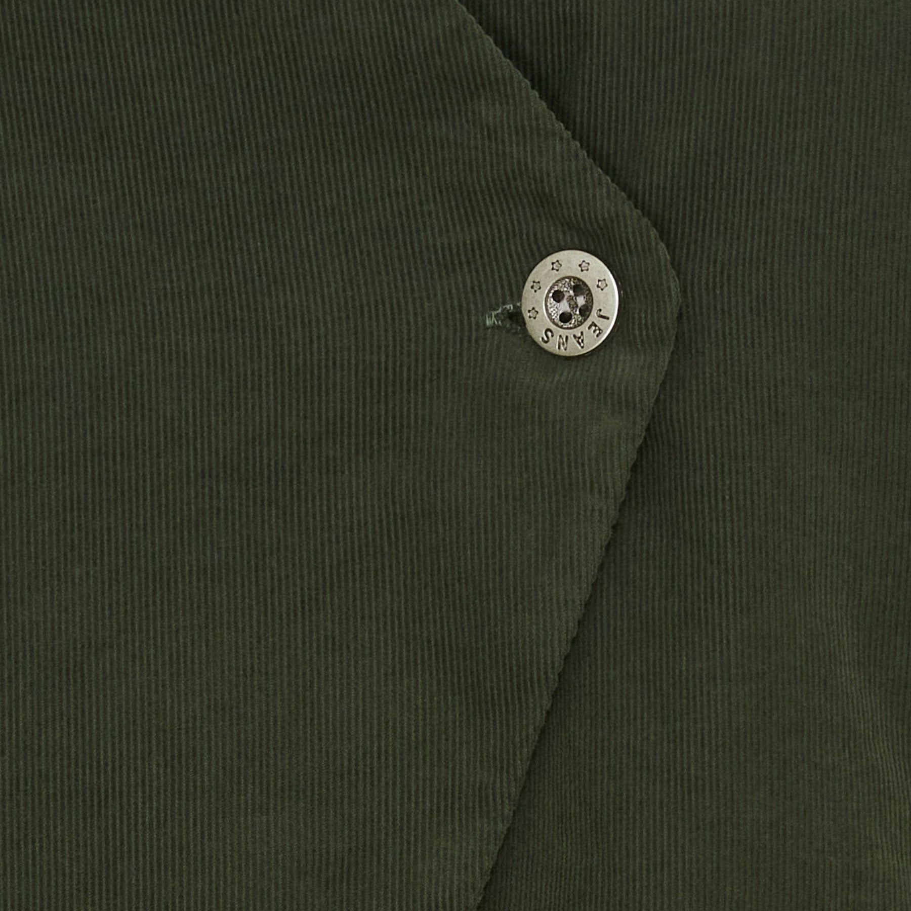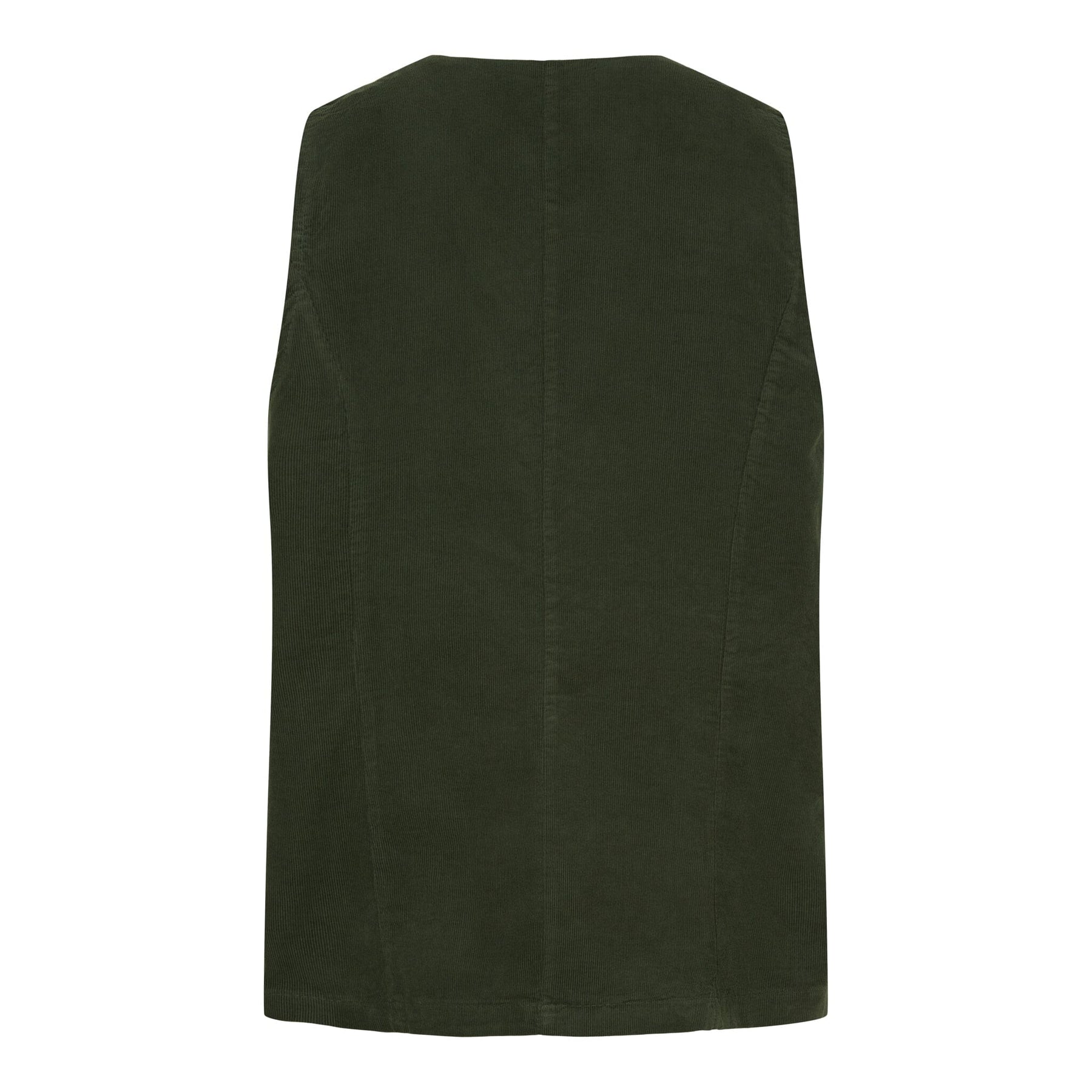 Militärgrüne Weste von Marta Du Chateau mit asymmetrischer Front und V-Ausschnitt. Die überlappende Front wird mit einem Knopf geschlossen und verleiht der Weste ein anderes Design.