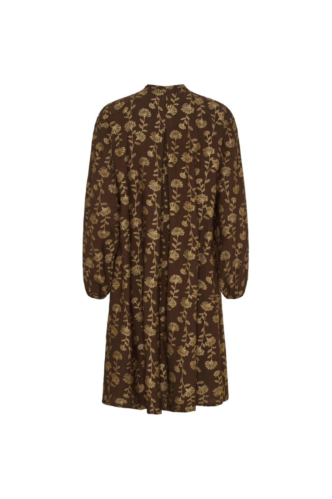 Braunes Kleid von Marta Du Chateau mit goldenem Blumenmuster. Das Kleid hat Knöpfe bis nach unten, einen Hemdkragen und lange Ärmel mit Gummizug an den Handgelenken.