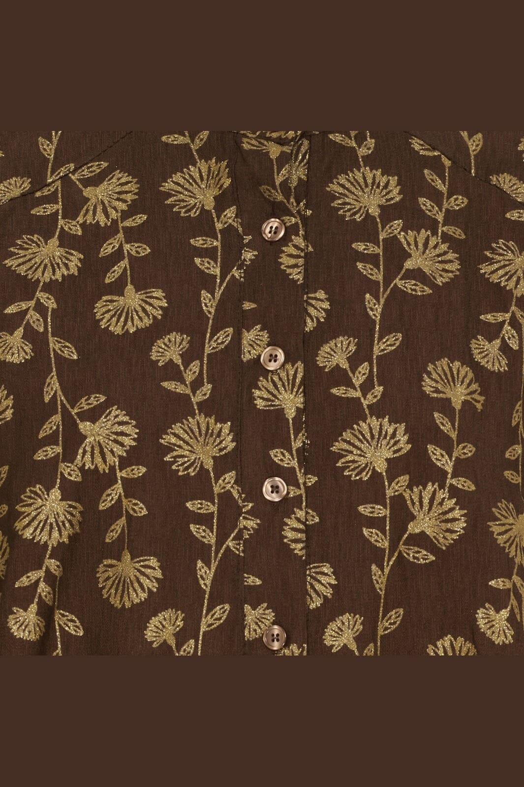 Braunes Kleid von Marta Du Chateau mit goldenem Blumenmuster. Das Kleid hat durchgehende Knöpfe, einen Hemdkragen und lange Ärmel mit Gummizug an den Handgelenken.