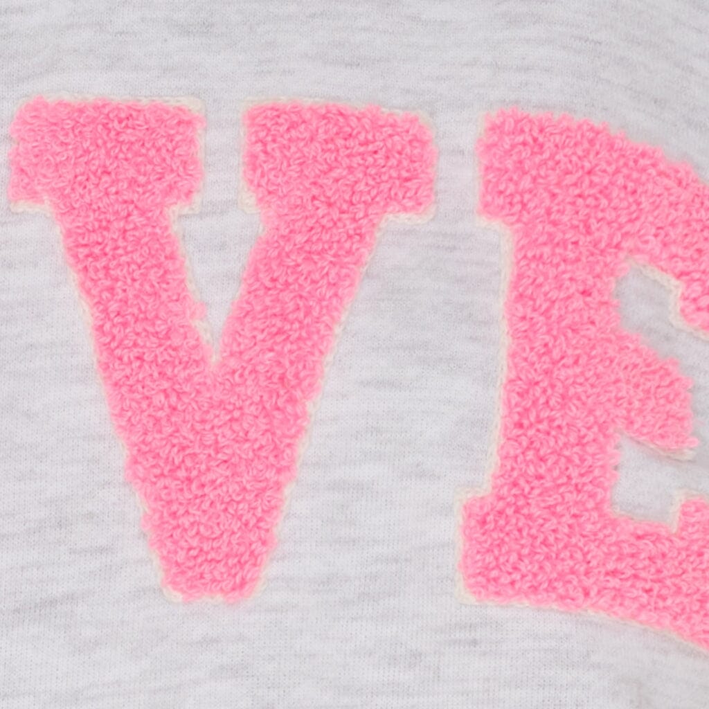 Ein hellgraues Sweatshirt von Marta Du Chateau mit rosa LOVE-Stickerei auf der Vorderseite. Das Sweatshirt hat eine melierte Oberfläche und eine legere Passform.