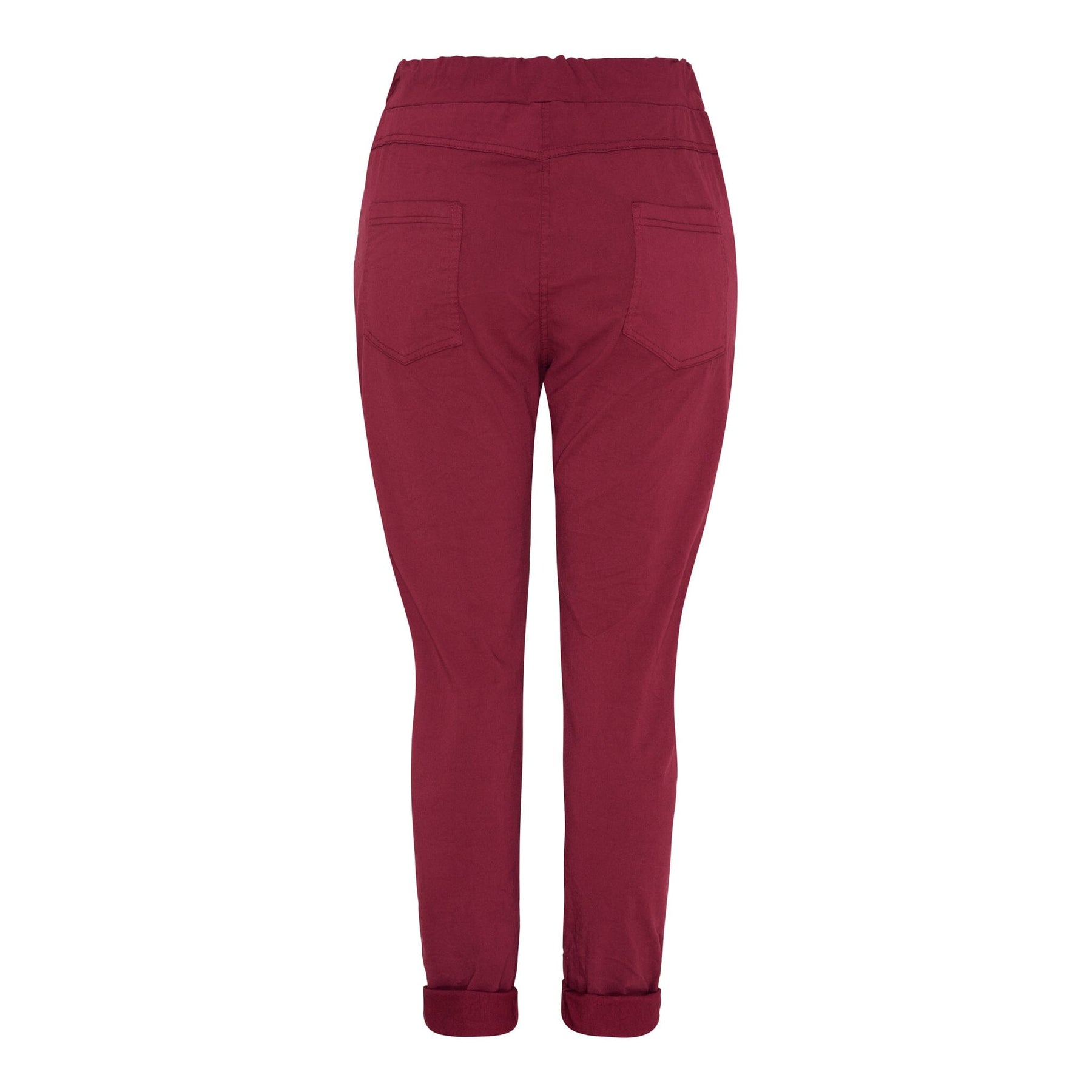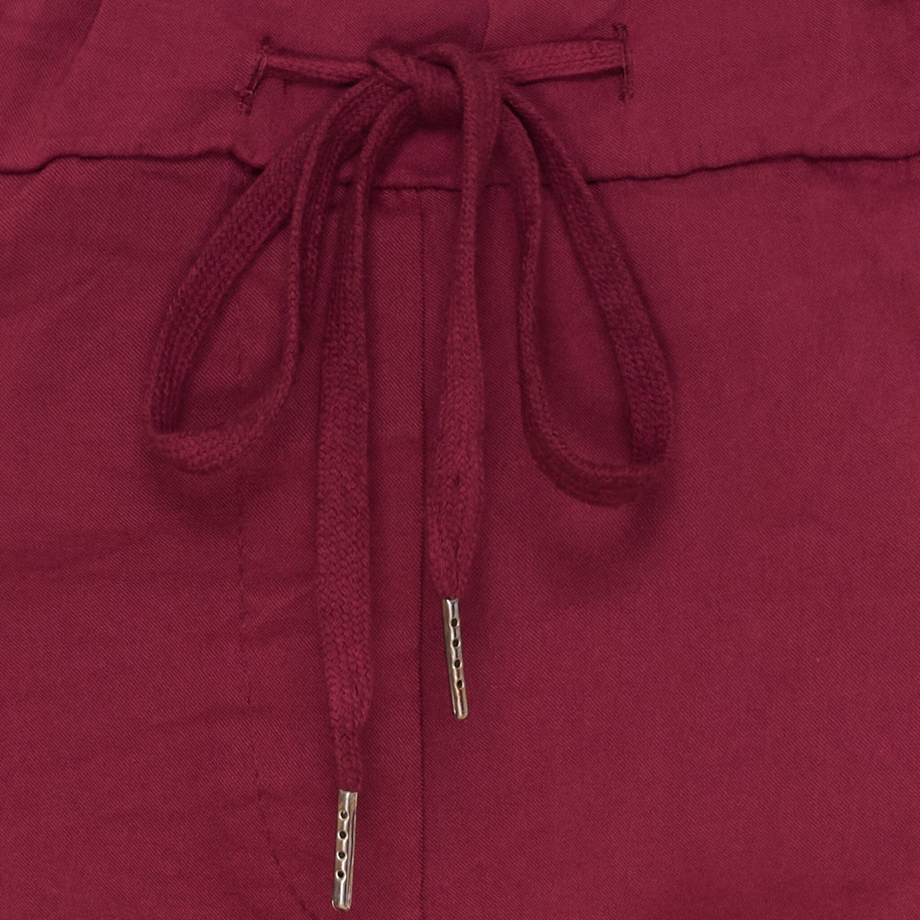 Bordeauxfarbene Hosen von Marta Du Chateau mit Kordelzug in der Taille. Die Hosen haben eine reguläre Passform und zwei Vordertaschen. Sie sind knöchellang mit umgeschlagenen Hosenbeinen.