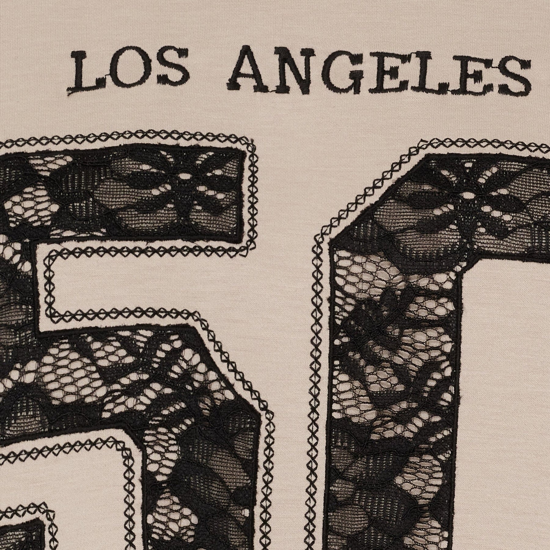 Beige Sweatshirt von Marta Du Chateau mit Print und Spitzendetails. Die Sweatshirt hat eine große 50 auf der Vorderseite mit dem Text LOS ANGELES und Champions darunter.