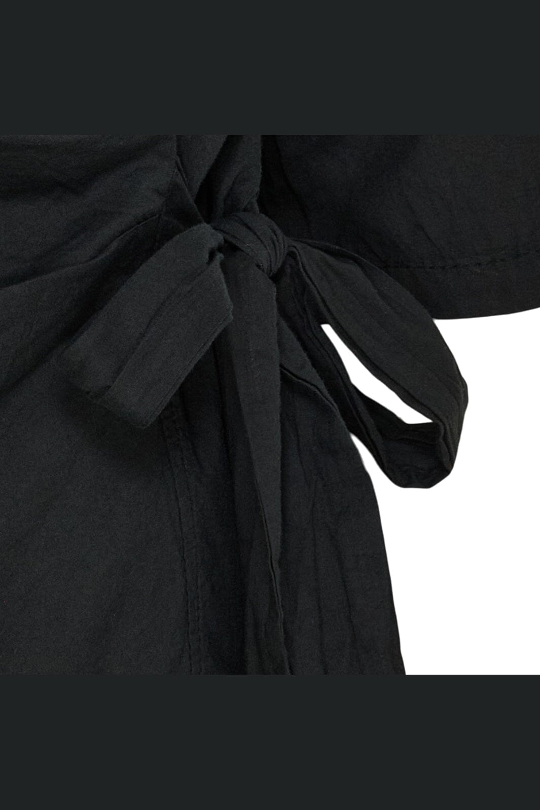 Schwarze Bluse von Marta Du Chateau aus 100 % Baumwolle. Die Bluse hat dreiviertellange Ärmel und ein Schleifendetail an der Seite. Der asymmetrische Saum sorgt für einen besonderen Schnitt.