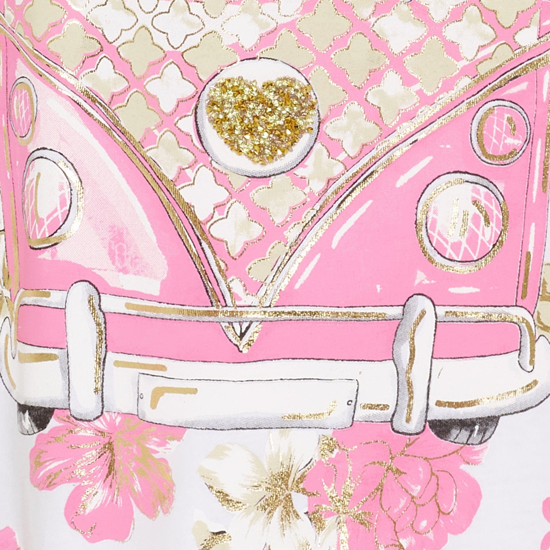 Weißes T-Shirt von Marta Du Chateau mit einem Druck eines rosa VW-Busses und Blumen in rosa und goldenen Nuancen. Das Design hat Pailletten und ein Blumenmuster auf der Vorderseite.