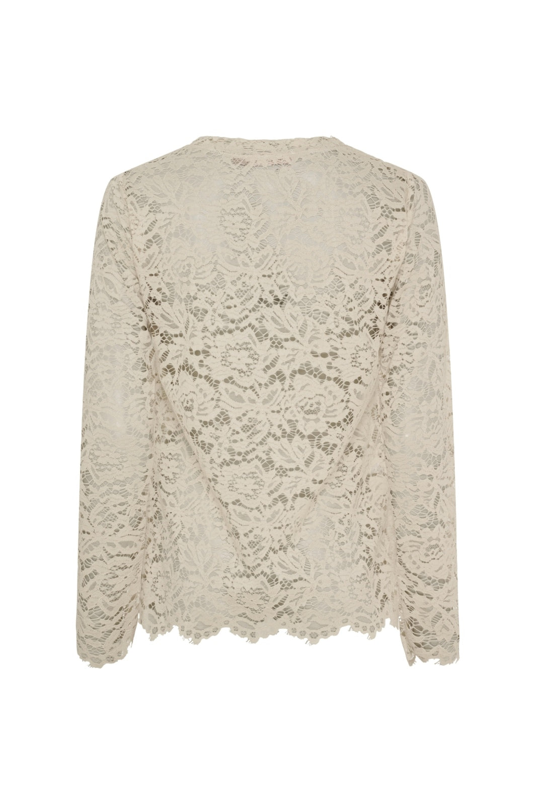 Beige Spitzenbluse von Marta Du Chateau mit Blumenmuster. Die Bluse hat einen runden Ausschnitt und lange Ärmel, was ihr einen klassischen Ausdruck verleiht.