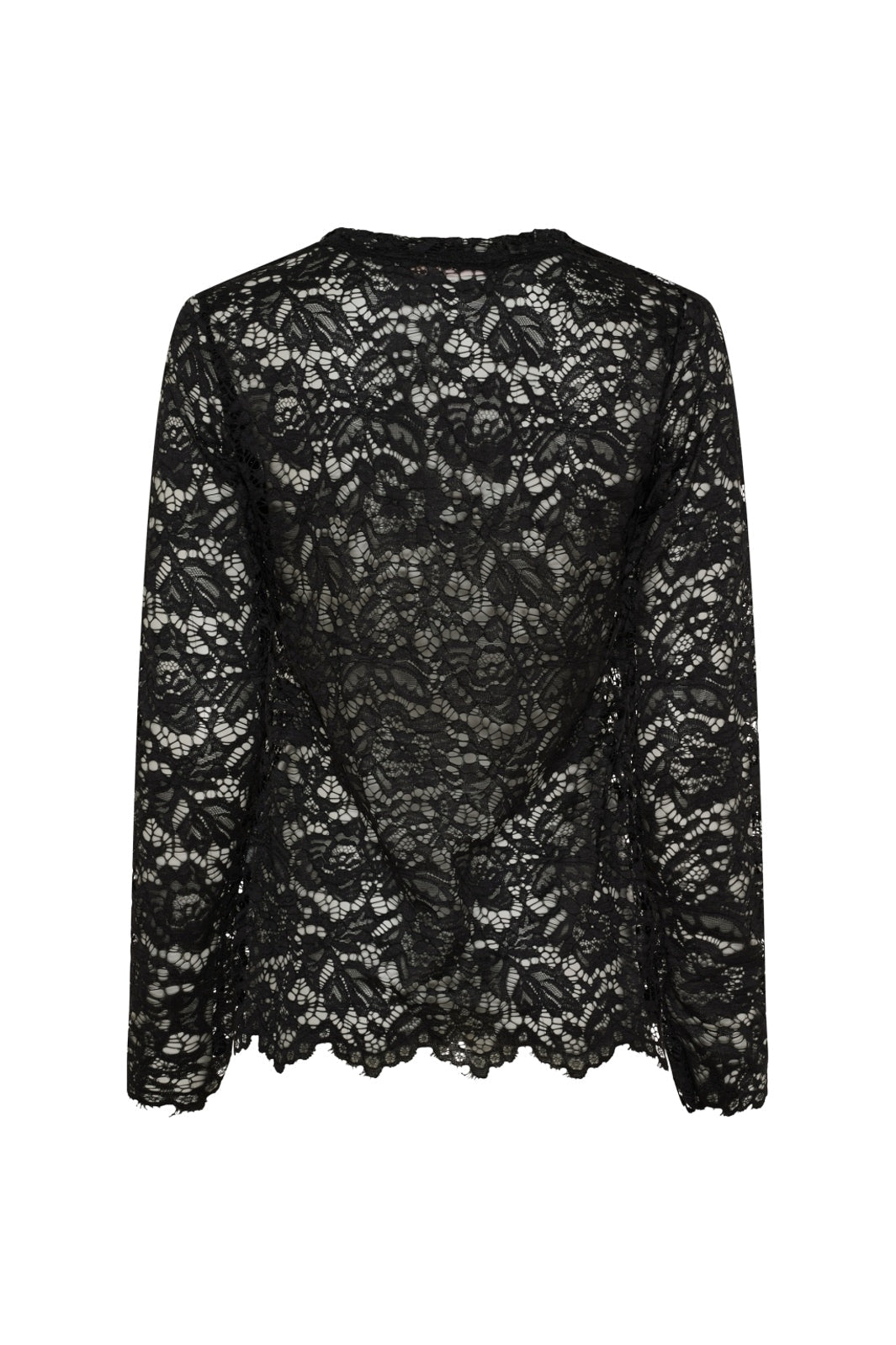 Schwarze Spitzenbluse von Marta Du Chateau mit einem Blumenmuster. Die Bluse hat einen runden Ausschnitt und lange Ärmel mit Spitzen-Details überall.