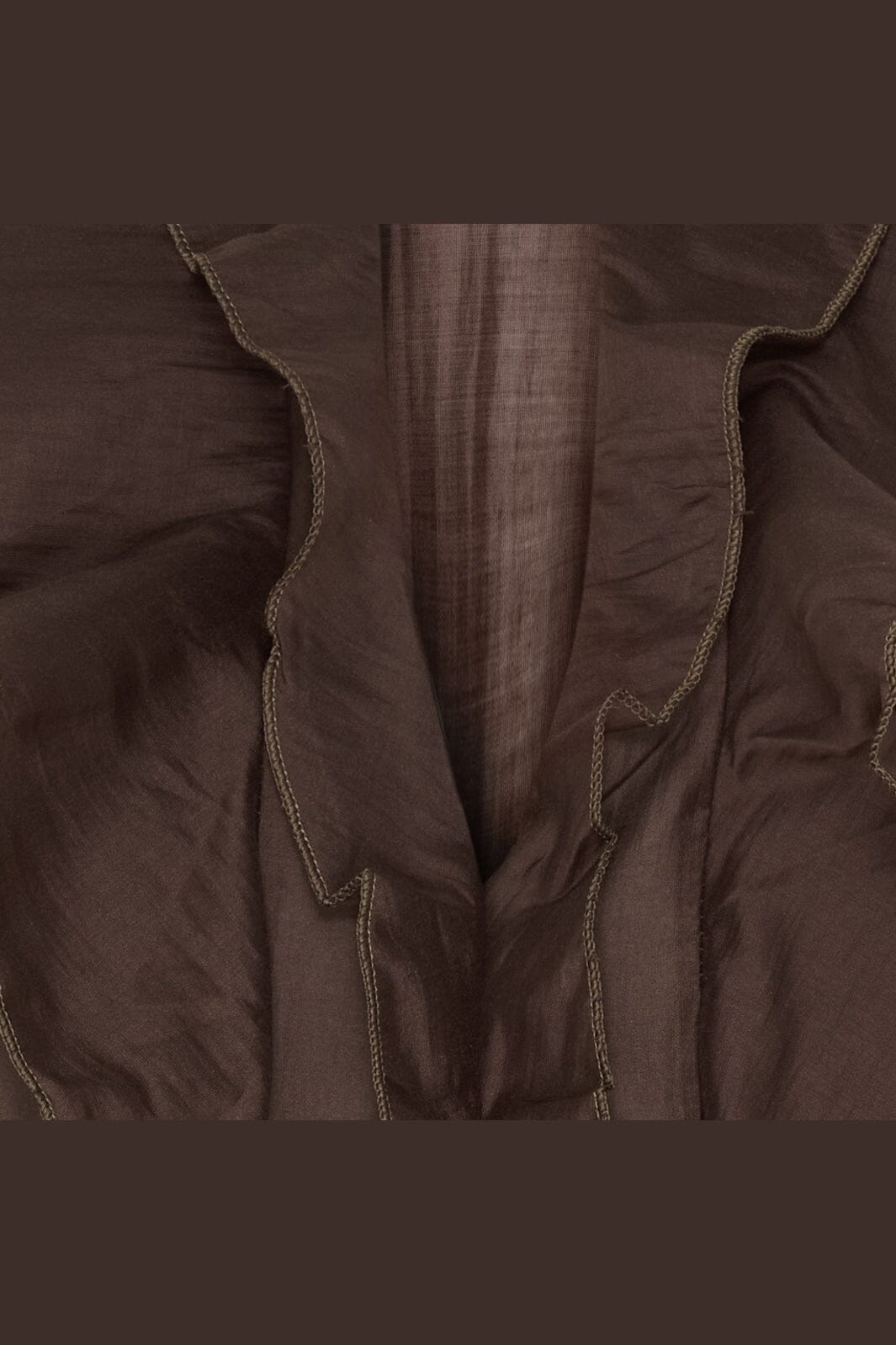 Braune Bluse von Marta Du Chateau mit Rüschendetails entlang des V-Ausschnitts. Die Bluse hat lange Ärmel und dekorative Nähte, die einen femininen Ausdruck verleihen.