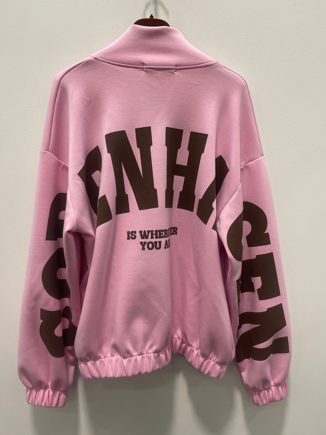 Rosa Strickjacke von Marta Du Chateau mit braunem Textdruck. Die Strickjacke hat einen hohen Kragen und einen Reißverschluss vorne in einer rosa/braunen Farbkombination.