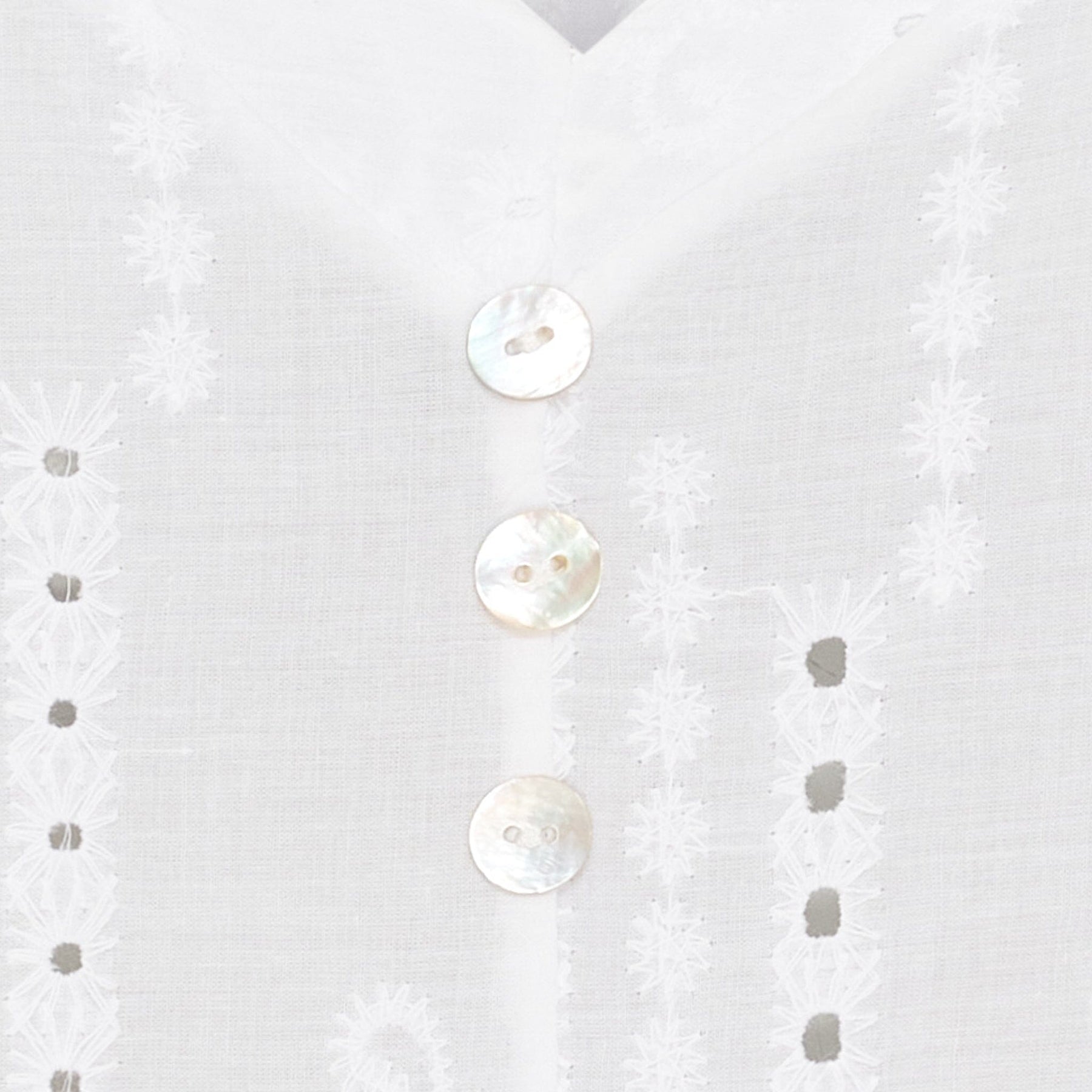 Weiße Top mit V-Ausschnitt von Marta Du Chateau. Die Top hat Blumenstickerei und kleine Löcher im Stoff, die ihr einen handgefertigten Charakter verleihen. Drei Perlmuttknöpfe am Ausschnitt.