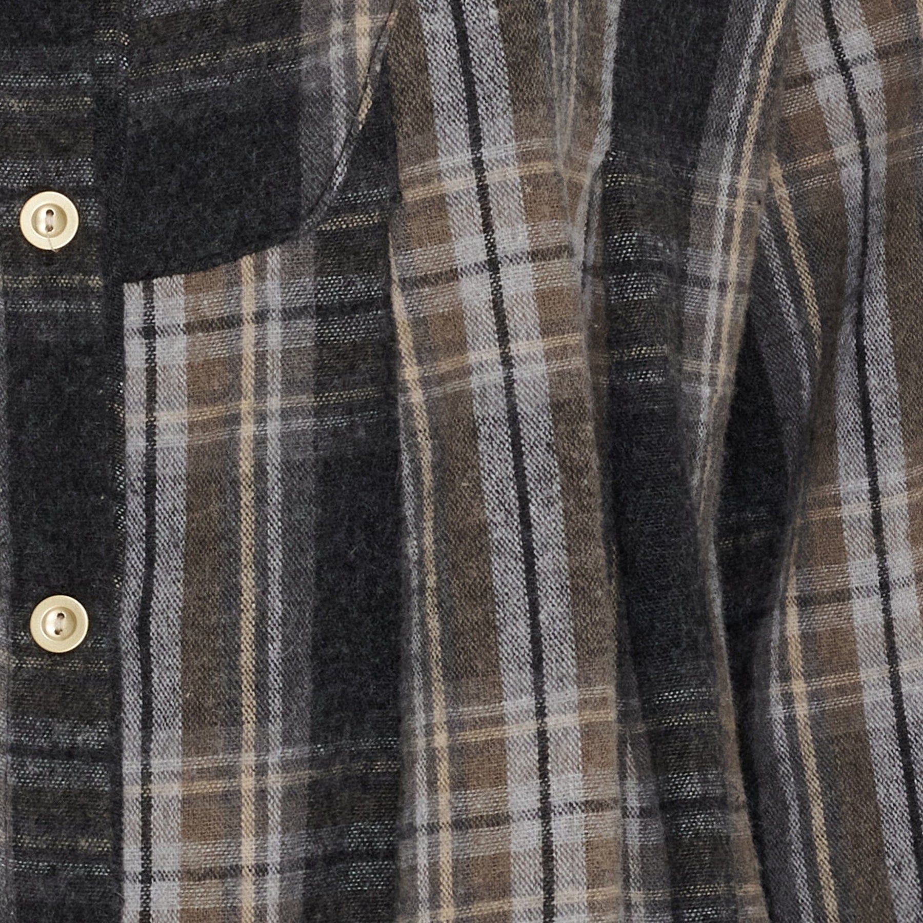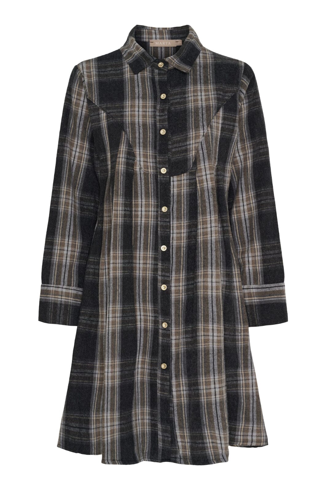 Grau kariertes Kleid von Marta Du Chateau mit Hemdkragen und Knopfleiste vorne. Das Kleid hat 3/4-Ärmel und Falten, die ihm einen femininen Ausdruck verleihen.