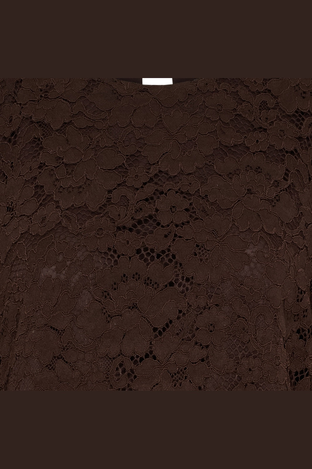 Braunes Spitzenkleid von Marta Du Chateau mit floralem Muster. Das Kleid hat kurze Ärmel, einen runden Ausschnitt und reicht bis zum Oberschenkel. Eine Knopfverschluss auf der Rückseite macht es einfach, es anzuziehen und auszuziehen.