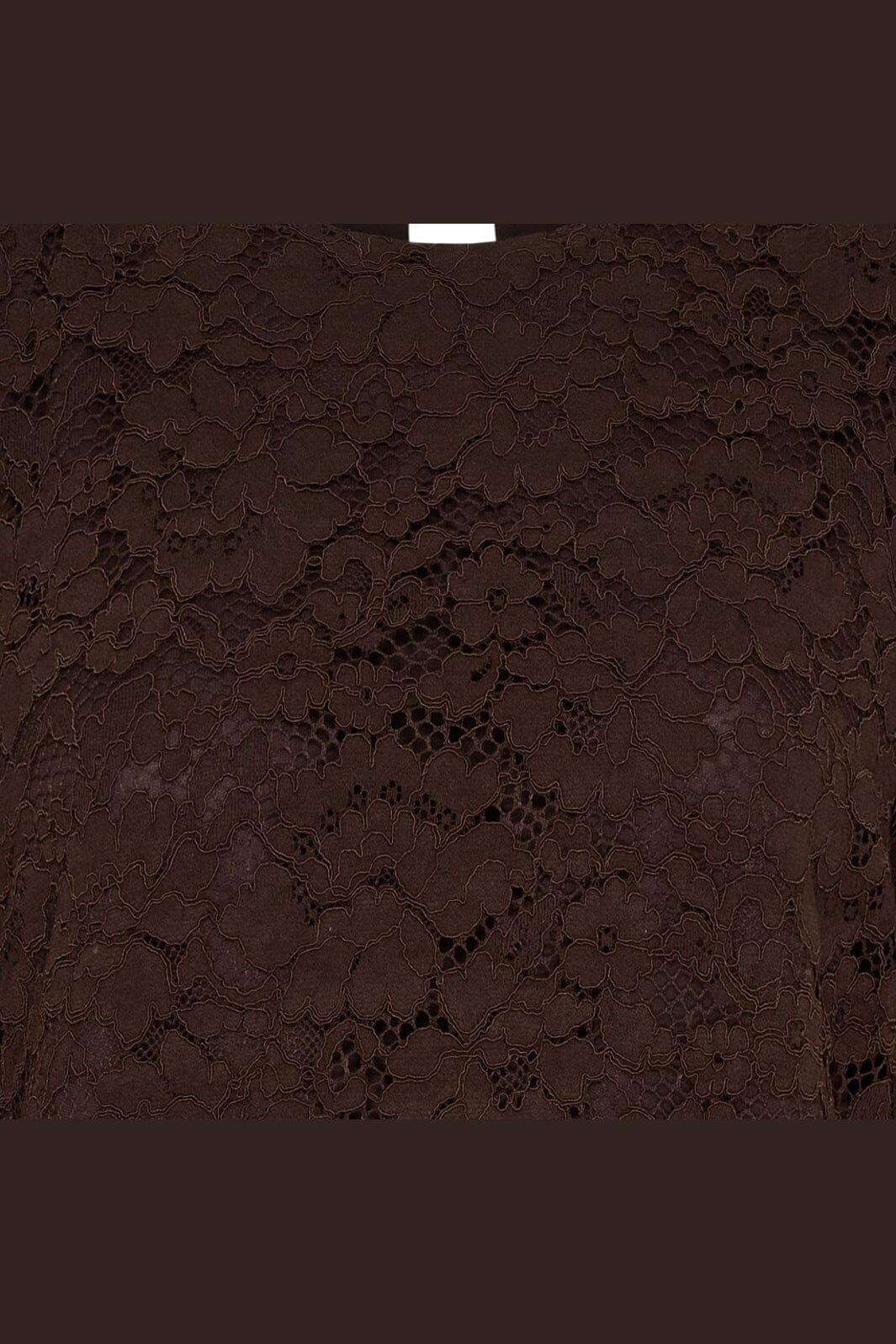 Braunes Spitzenkleid von Marta Du Chateau mit Blumenmuster. Das Kleid hat kurze Ärmel, einen runden Halsausschnitt und reicht bis zum Oberschenkel. Ein Knopfverschluss hinten macht es einfach an- und auszuziehen.