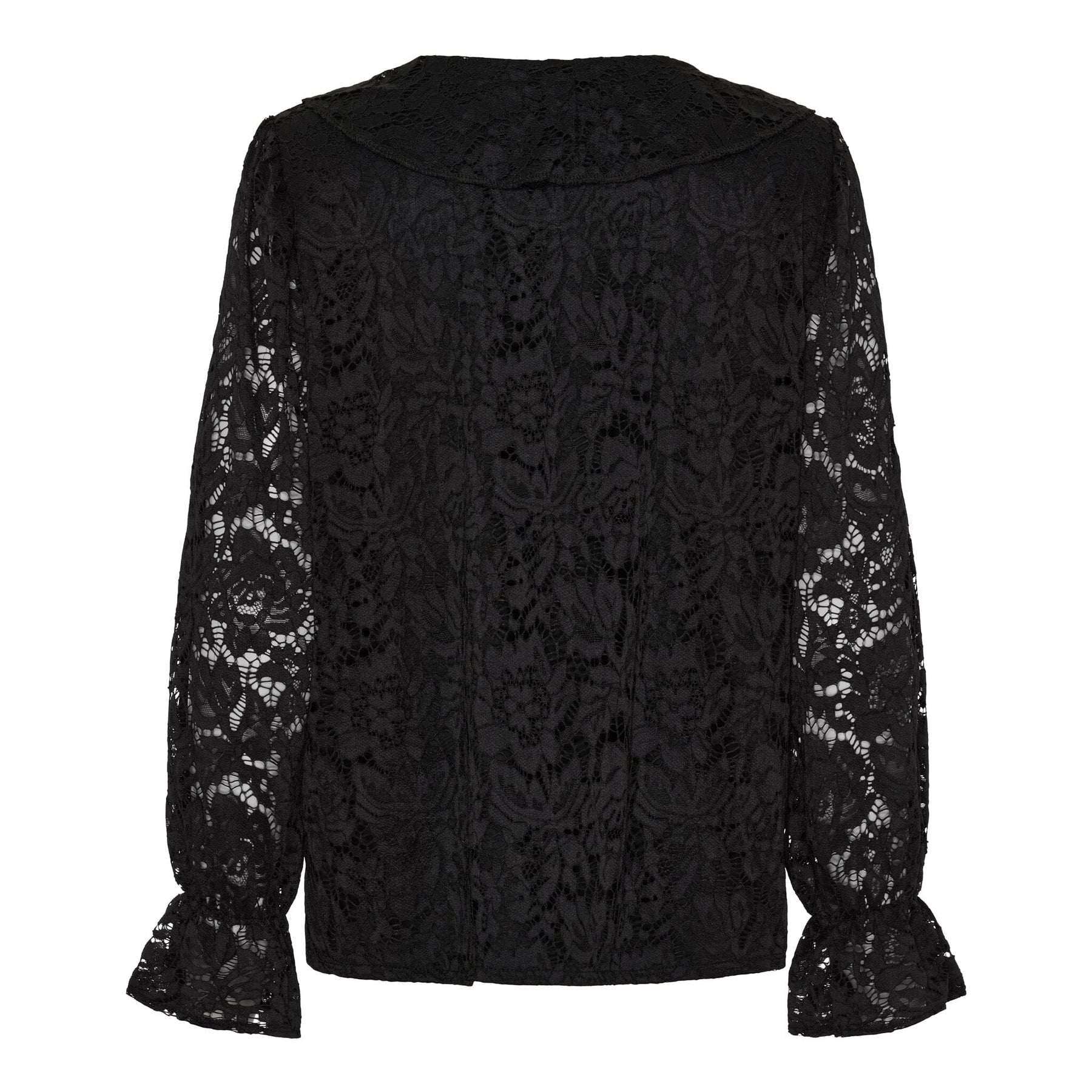 Schwarze Spitzenbluse von Marta Du Chateau mit V-Ausschnitt und Rüschen. Die Bluse hat lange Ärmel mit Spitzendetails und passt sowohl zu formellen als auch zu lässigen Anlässen.