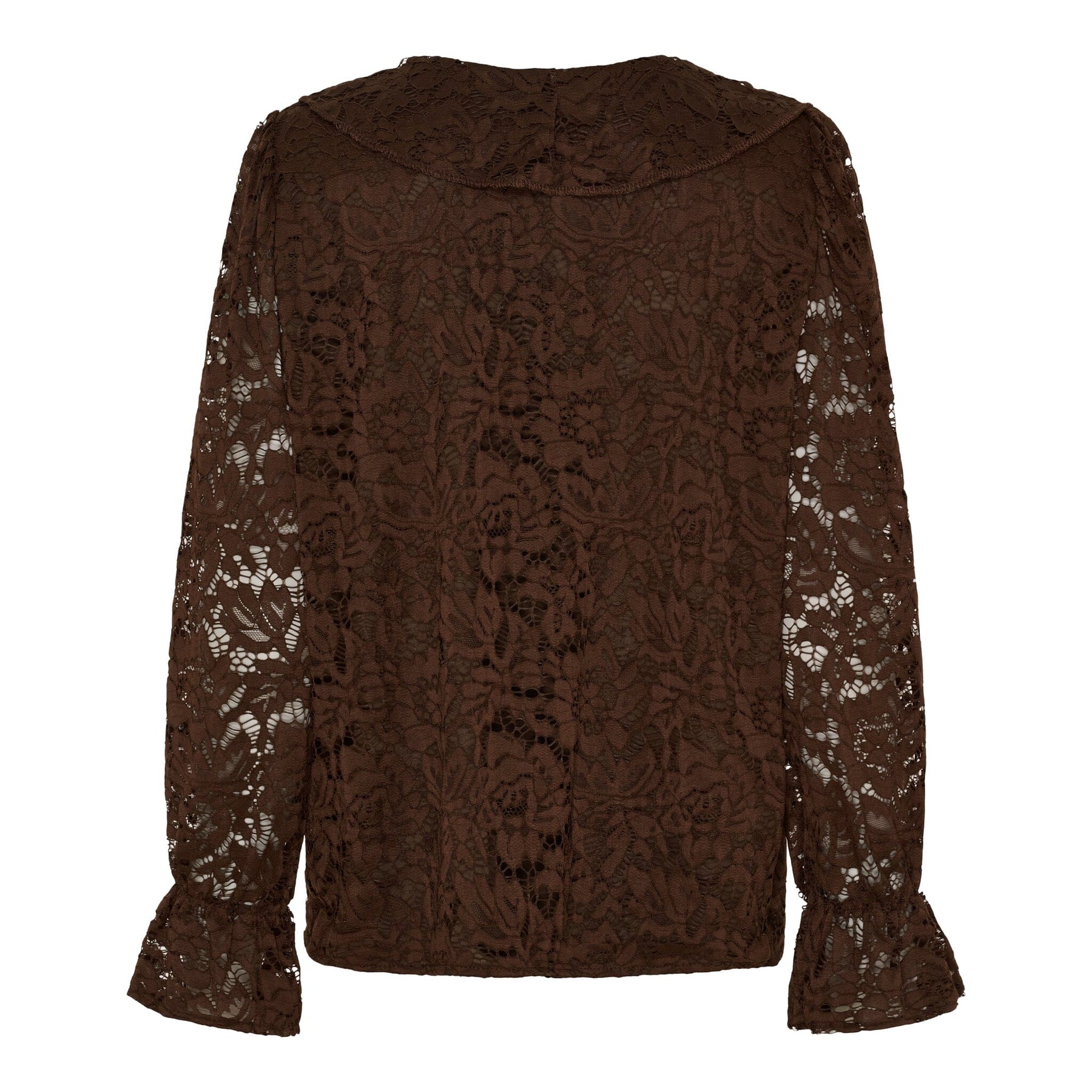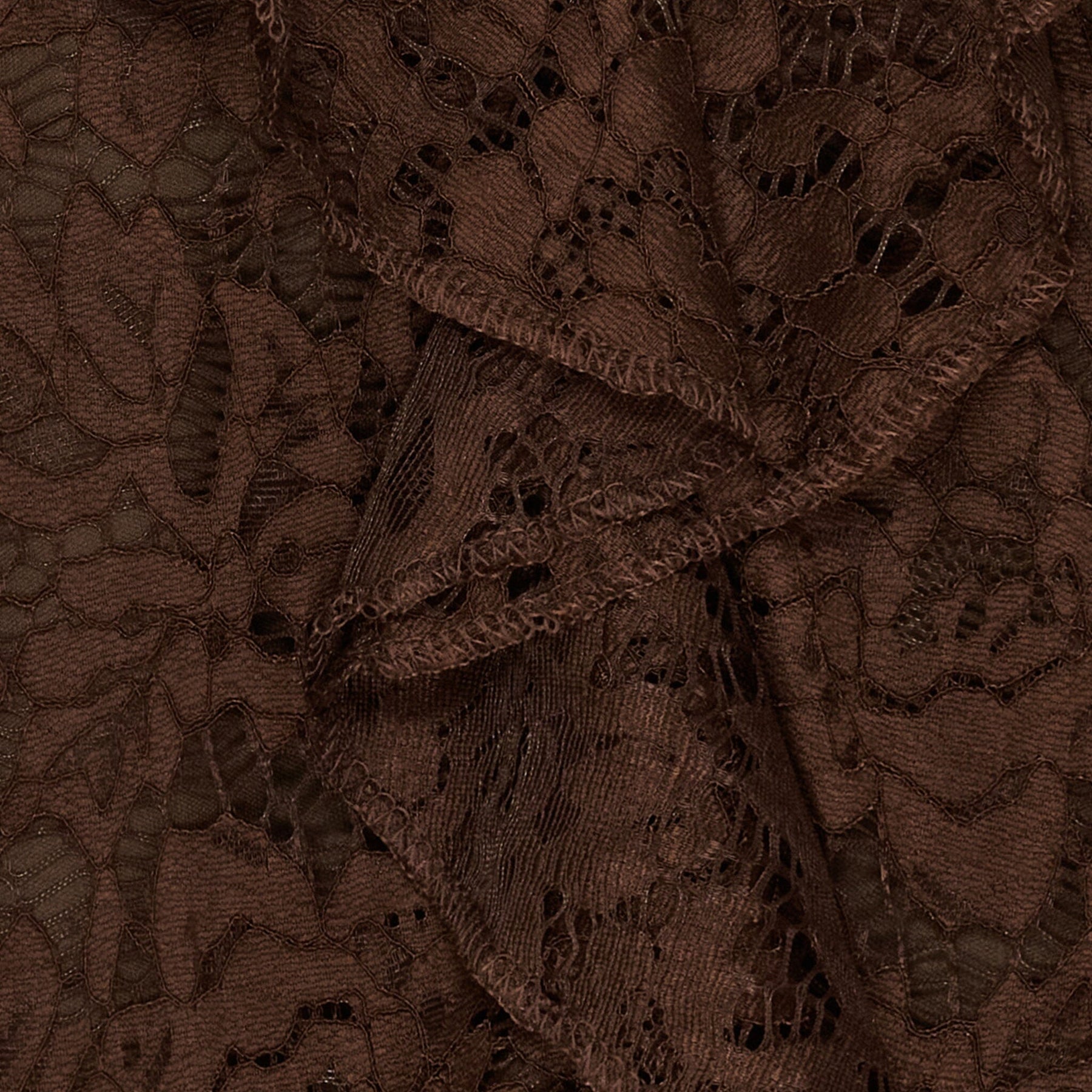Braune Spitzenbluse von Marta Du Chateau mit Blumenmuster und Rüschen-Details. Die Bluse passt sowohl zu formellen als auch zu entspannten Anlässen sowie zu festlichen Gelegenheiten.