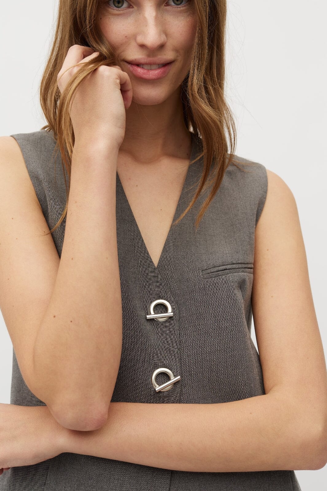 Weste von MbyM in grauer Farbe mit meliertem Muster. Die Weste kann sowohl zu formellen Anlässen, im Alltag als auch zu festlichen Gelegenheiten getragen werden.