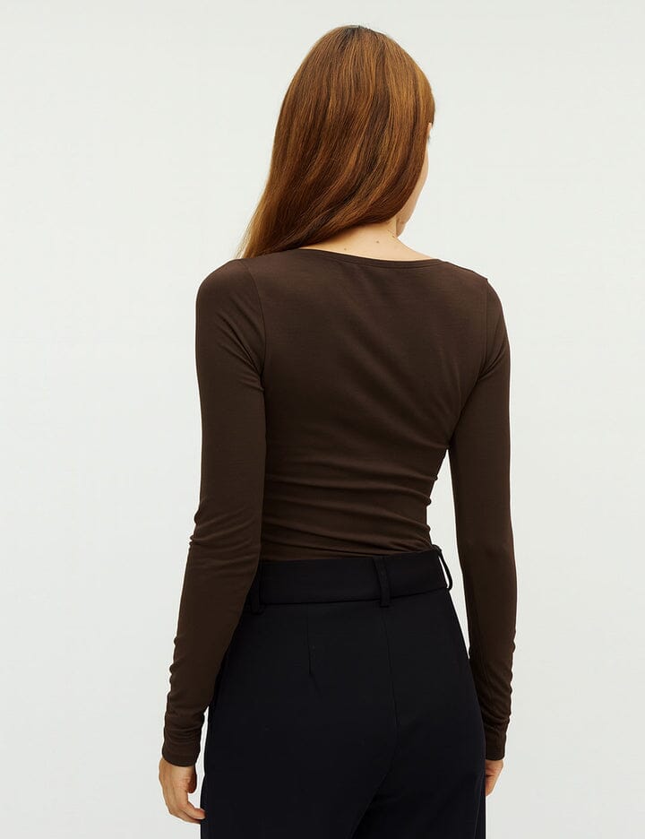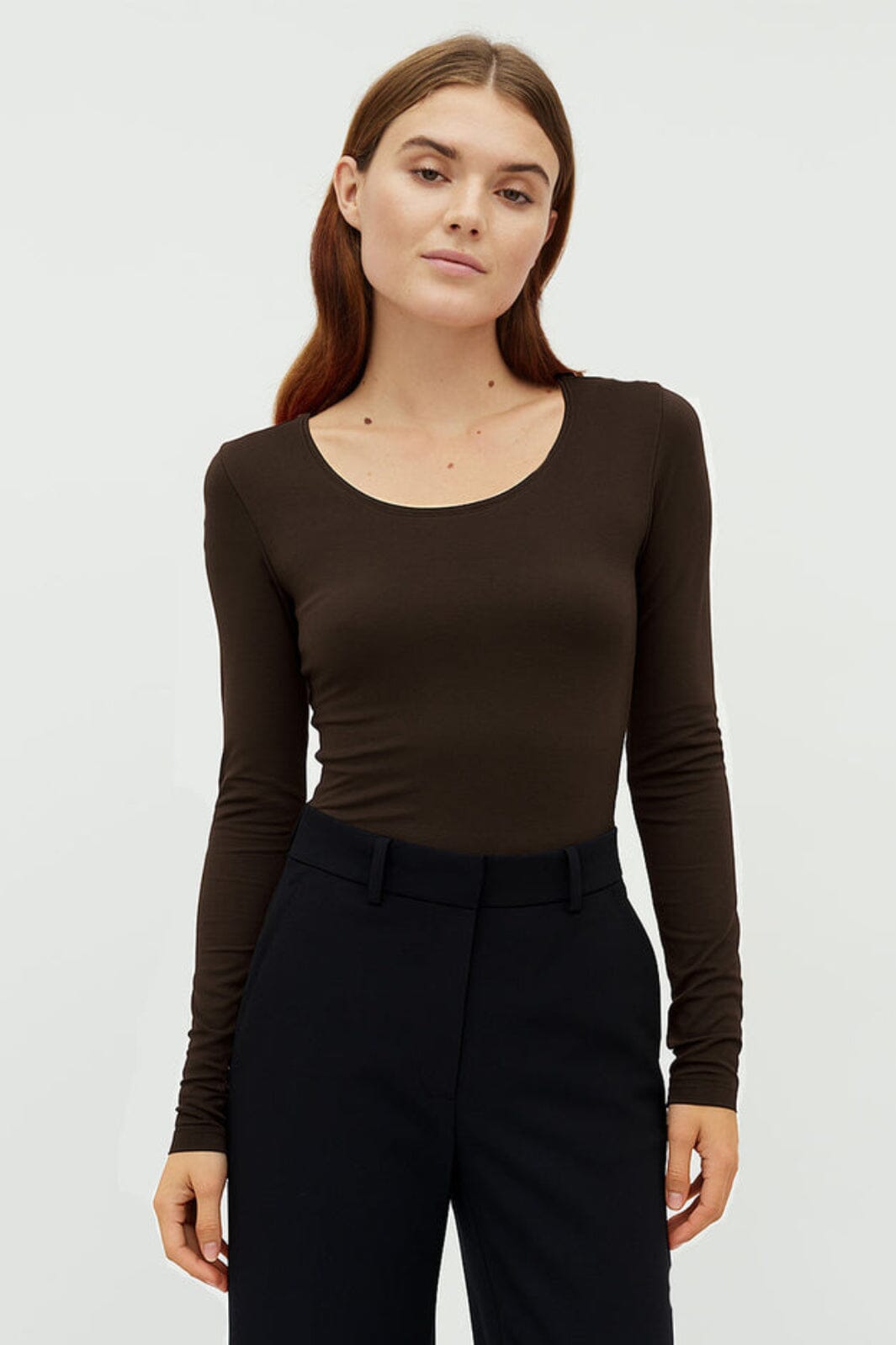 Ein langärmliges Top von MbyM in dunkelbrauner Farbe. Das Top hat eine figurbetonte Passform und besteht aus Modal mit Elasthan.
