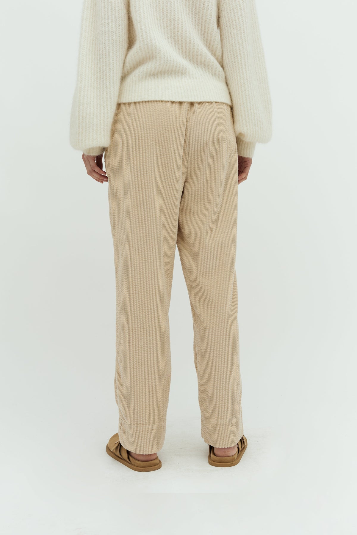 Beige Hosen von MbyM aus strukturiertem Baumwollstoff mit elastischem Bund. Die Hosen haben ein gerades Bein-Design und enden an den Knöcheln. Sie sind für den Gebrauch zu Hause und im Alltag konzipiert.