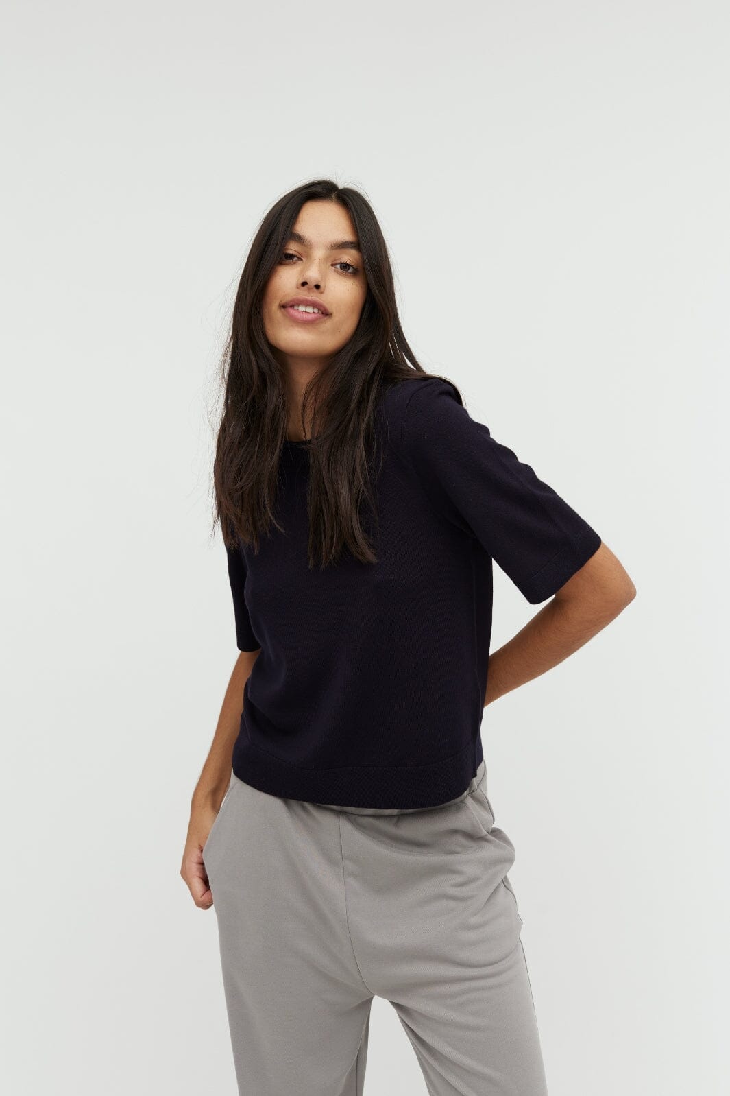 Entdecke den Carla-M Strickpullover von MbyM, präsentiert in dem tiefen Farbton Night Sky, der deiner Garderobe einen stilvollen Ausdruck verleiht.
