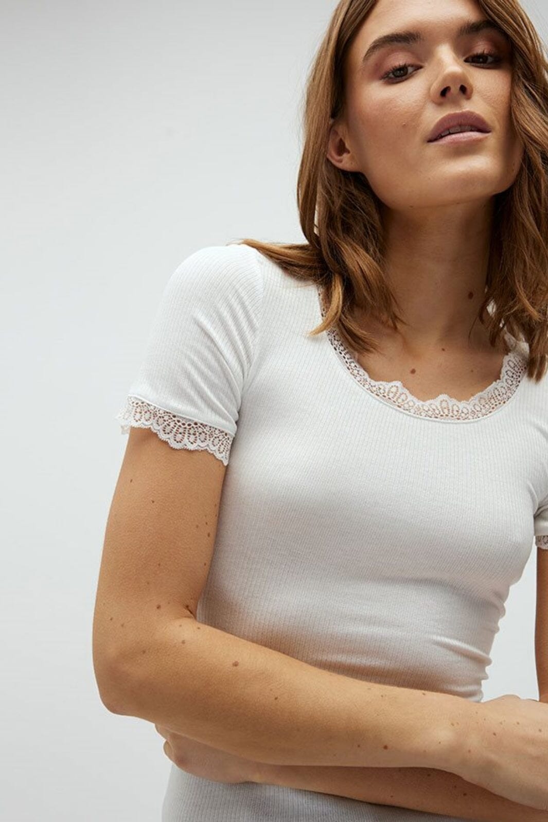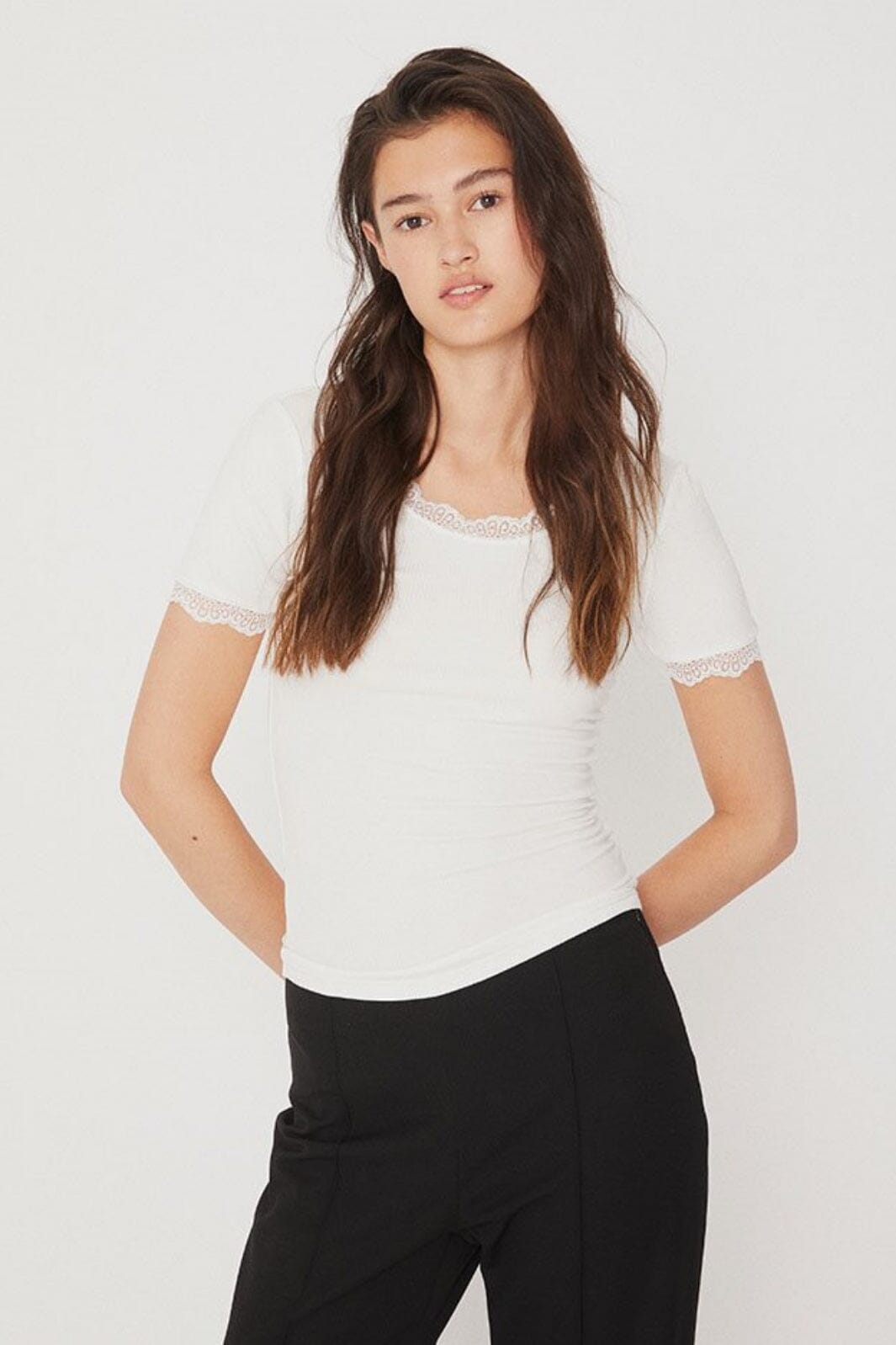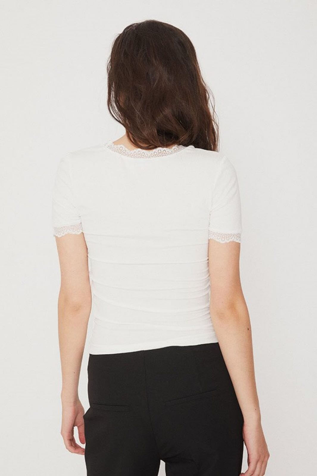 Weißes T-Shirt von MbyM mit Spitzenkante am Hals und an den Ärmeln. Das figurbetonte Modell hat kurze Ärmel und einen runden Halsausschnitt, der zusammen mit den Spitzenkanten dem T-Shirt einen femininen Ausdruck verleiht.