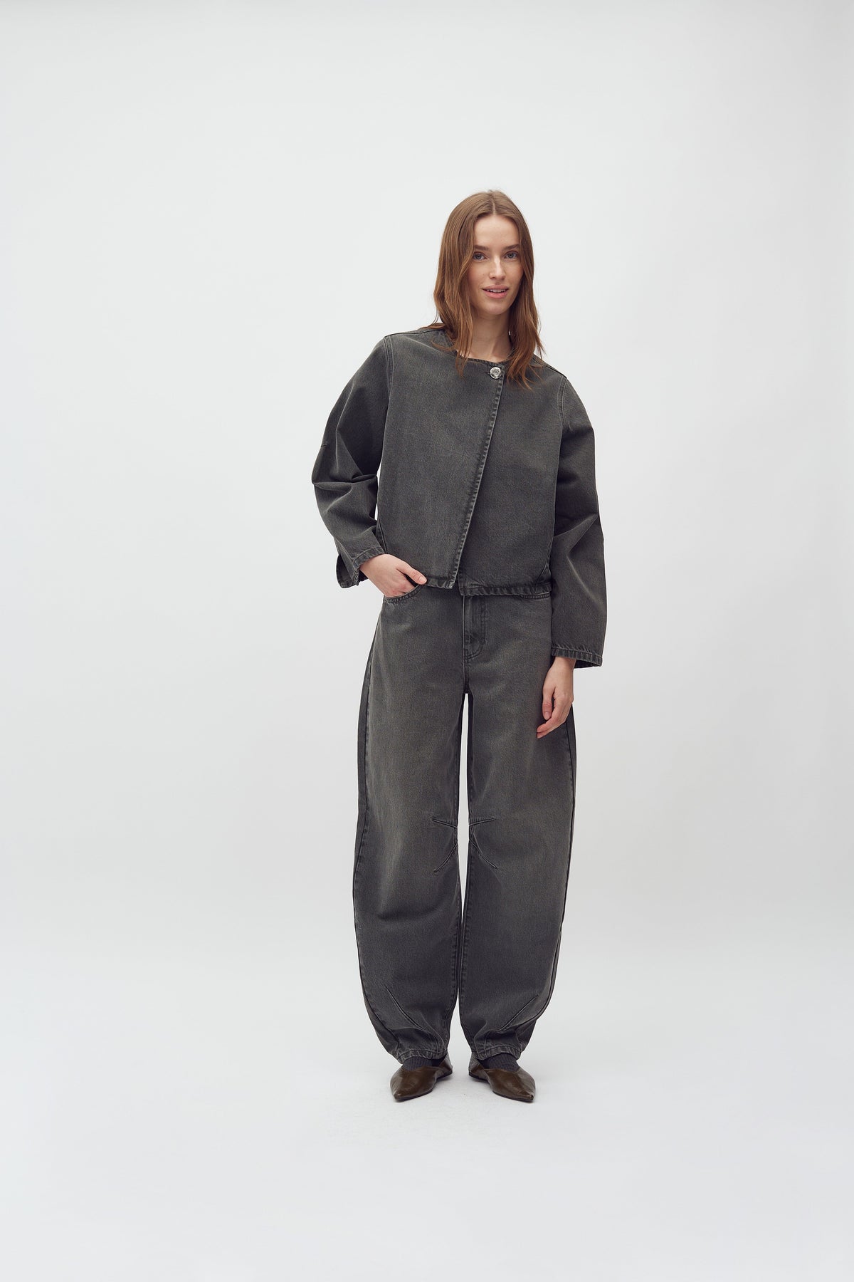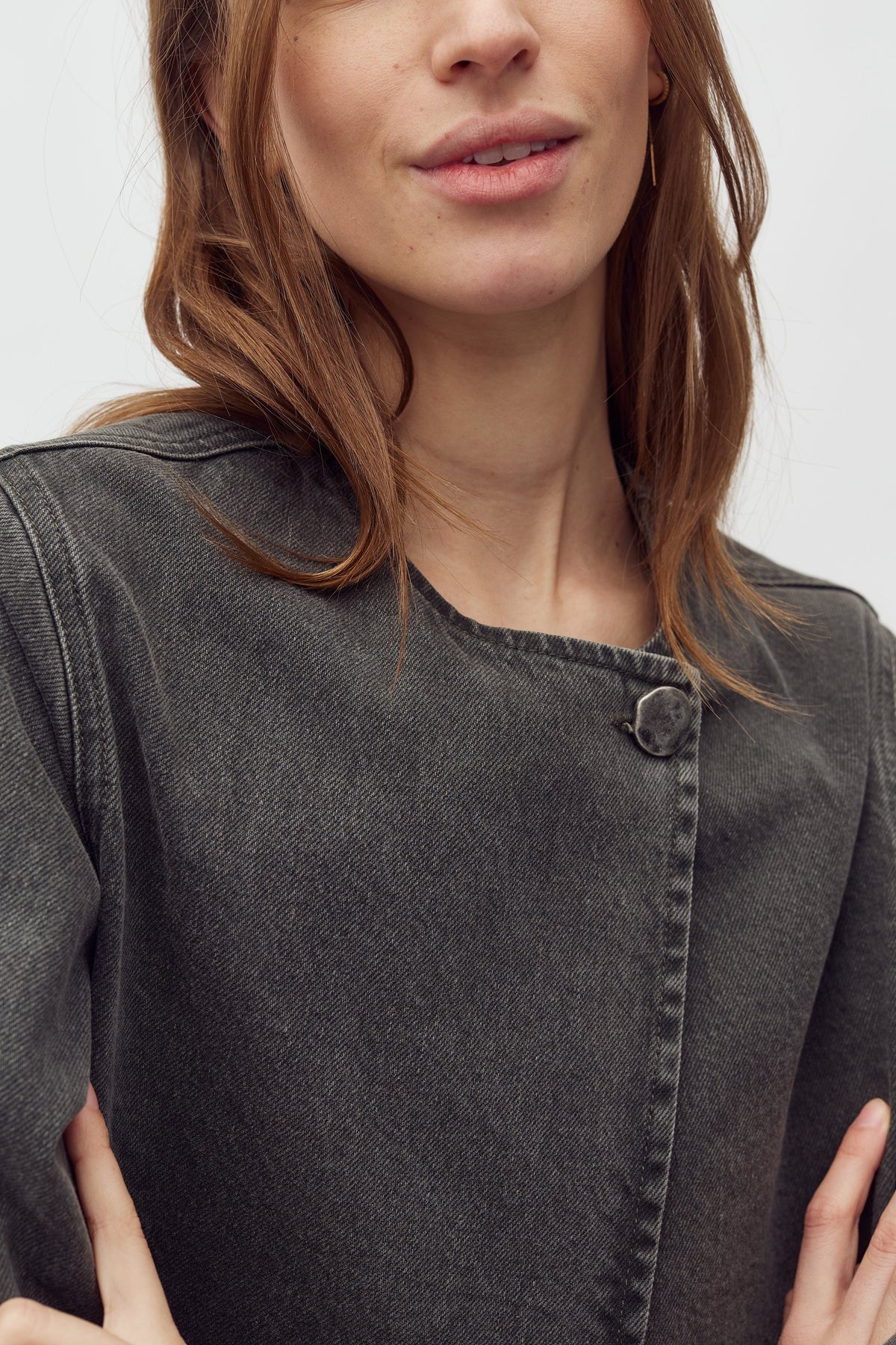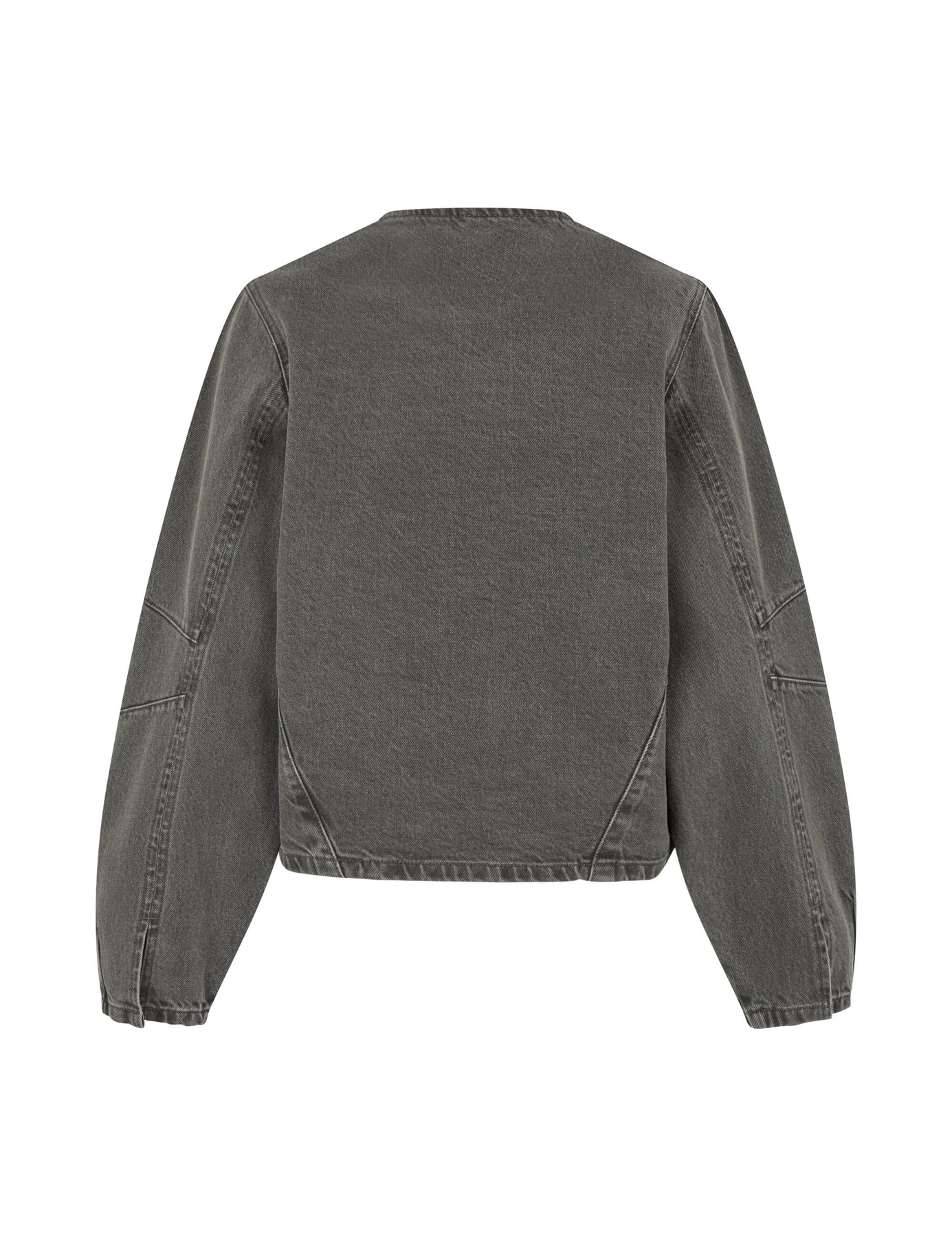 Khaki-grüne Jacke von MbyM mit oversized Passform. Sie hat einen Acid-Wash-Effekt und dekorative Nähte, die der Jacke einen rustikalen Look verleihen.
