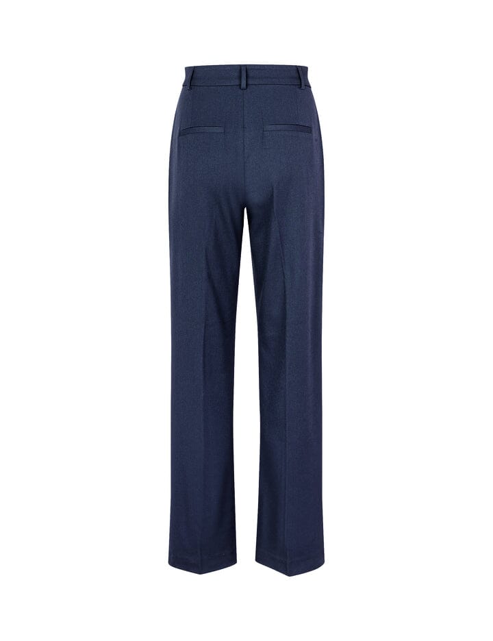 Dunkelblaue Hose von MbyM mit lockerer Passform und weitem Bein. Die Hose ist bodenlang und hat eine normale Leibhöhe mit Gürtelschlaufen.
