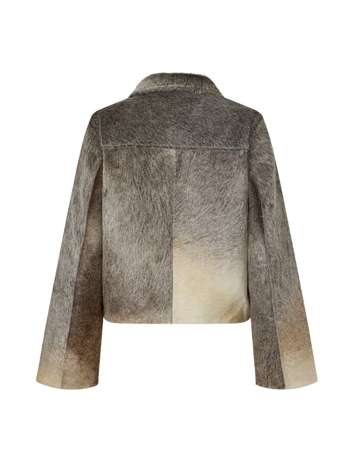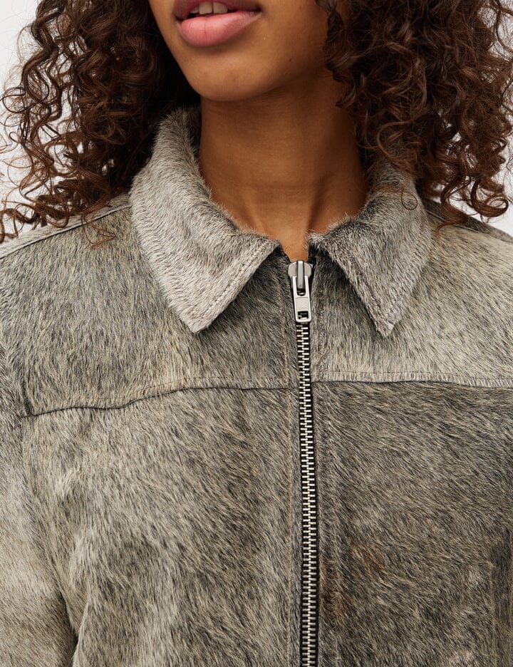 Jacke von MbyM, aus Rindsleder in einem grauen Farbton mit Tierdruck. Die Jacke hat einen Reißverschluss vorne und dekorative Nähte.