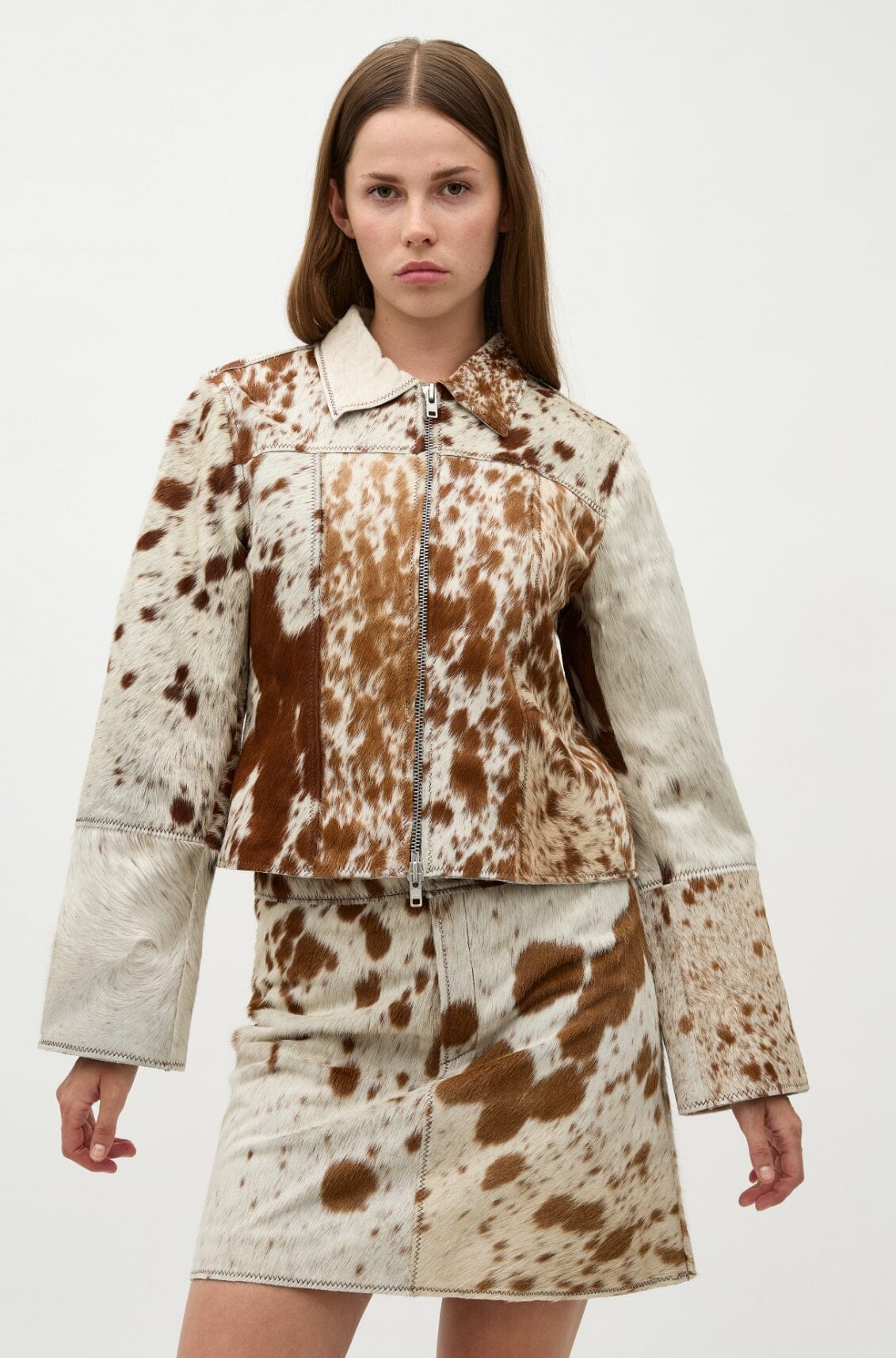 Kurze Lederjacke von MbyM mit braun-weißem Kuhfellmuster. Die Jacke hat einen Hemdkragen, einen Reißverschluss und lange Ärmel. Das kurze Modell besteht aus echtem Kalbsleder mit dekorativen Nähten.
