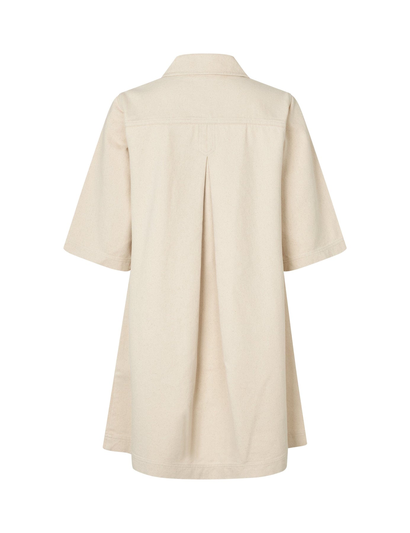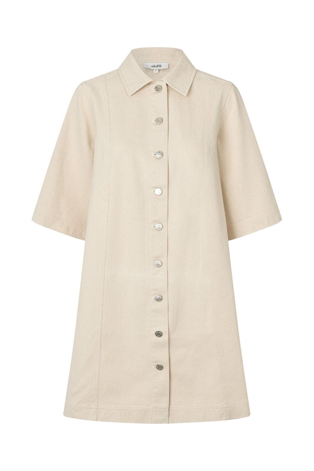 Ein beigefarbenes Hemdkleid von MbyM aus 100 % Baumwolle. Das Kleid hat einen Hemdkragen, kurze Ärmel und eine Knopfleiste, die vorne komplett durchgeht.