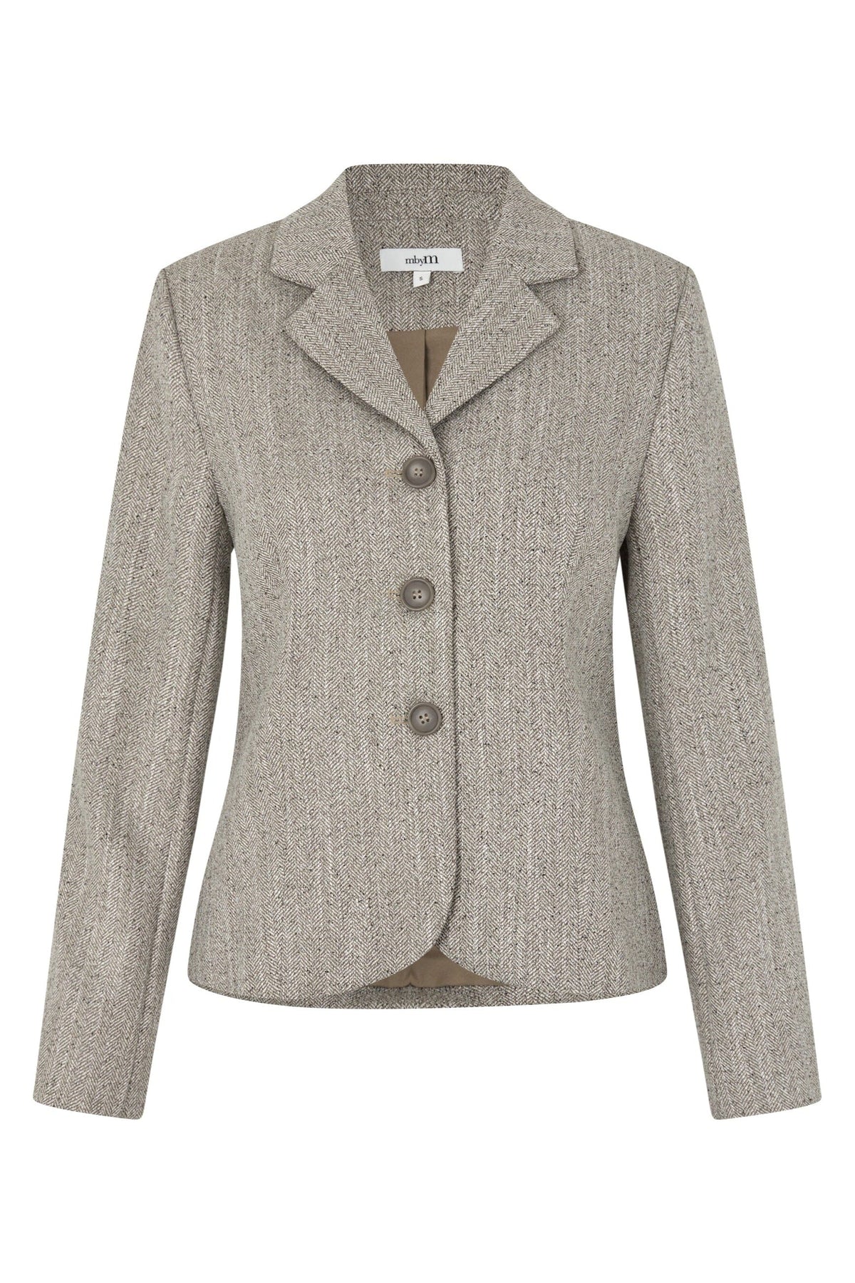 Grauer Blazer von MbyM mit Fischgrätenmuster und melierter Oberfläche. Er hat einen V-Ausschnitt, lange Ärmel und Knopfverschluss vorne.